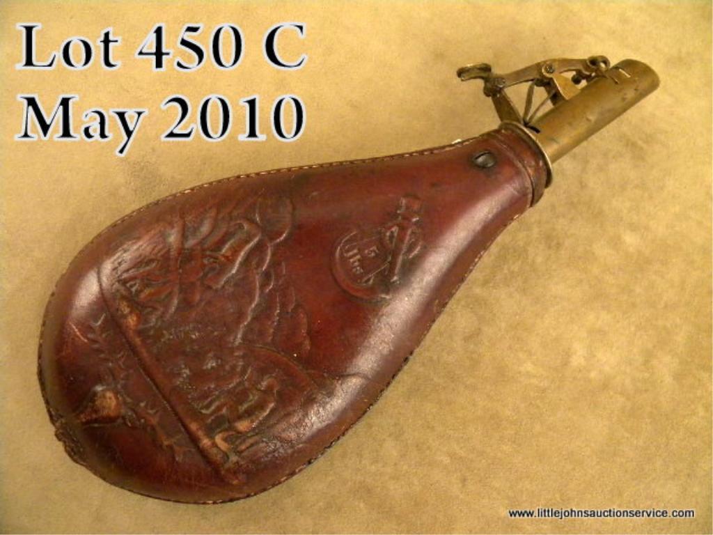 Antique leather shot flask with graduated brass charger marked “Am. Flask & Cap Co.” in overall good condition with embossed hunting scenes on both sides of leather and marked “5 lbs.” Est.: $30-$60.