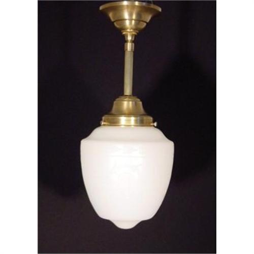 CIRCA 1920 A STENCELED MILK GLASS SHADE WITH BRASS HARDWARE CEILING FIXTURE,HEIGHT 18" DIAMETER 7.5".</em></td>