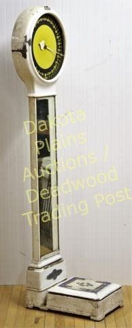 originally sat in front of Silver Star Bar in Lead, S.D. made Peerless Scale Company, scale is complete with back in need of glass, cleaning and adjustment, 71" tall. Est. 150-300