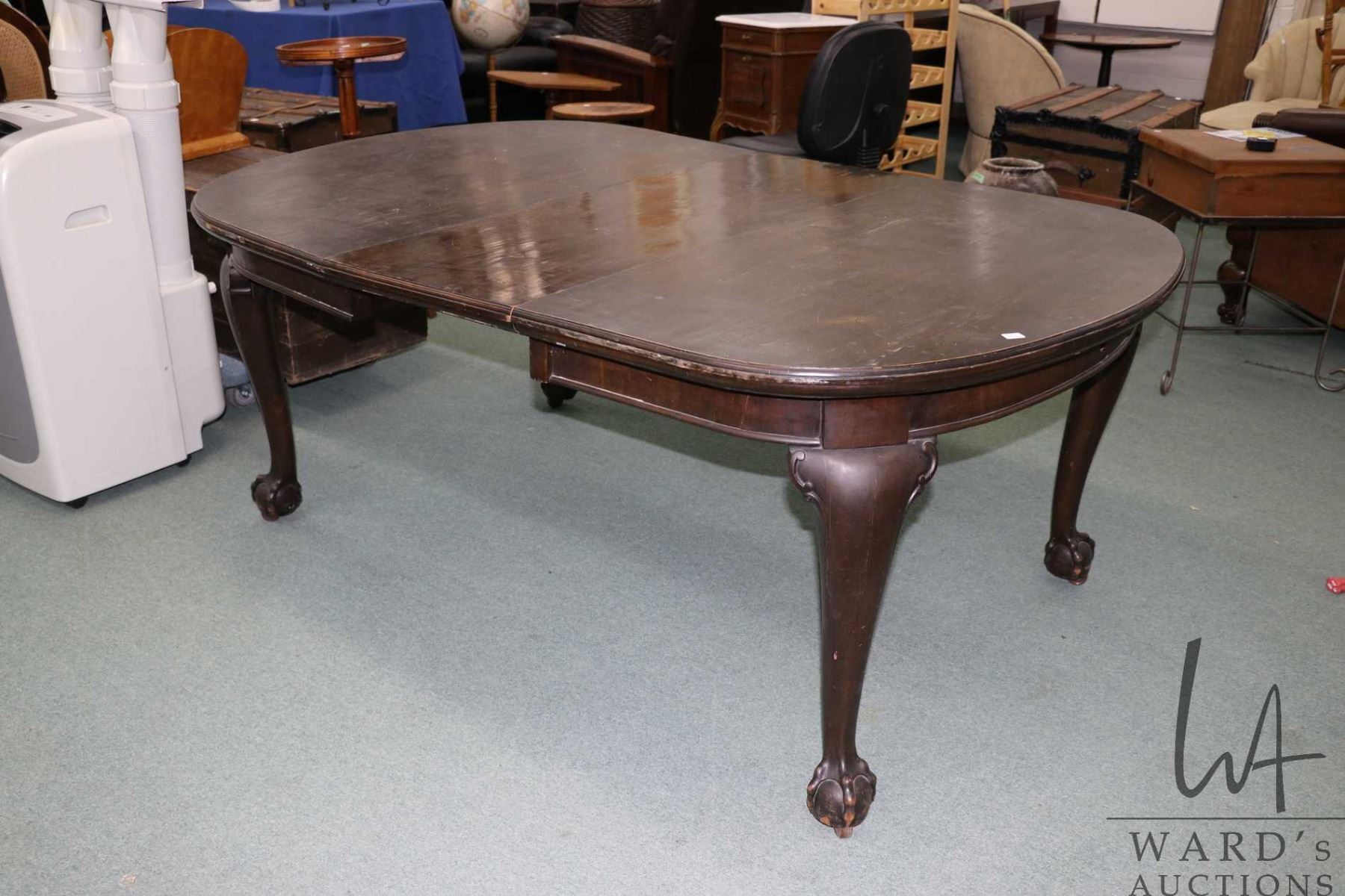 Antique mahogany crank table 48" X 52" plus one 17" insert leaf, with heavy ball and claw feet and includes crank