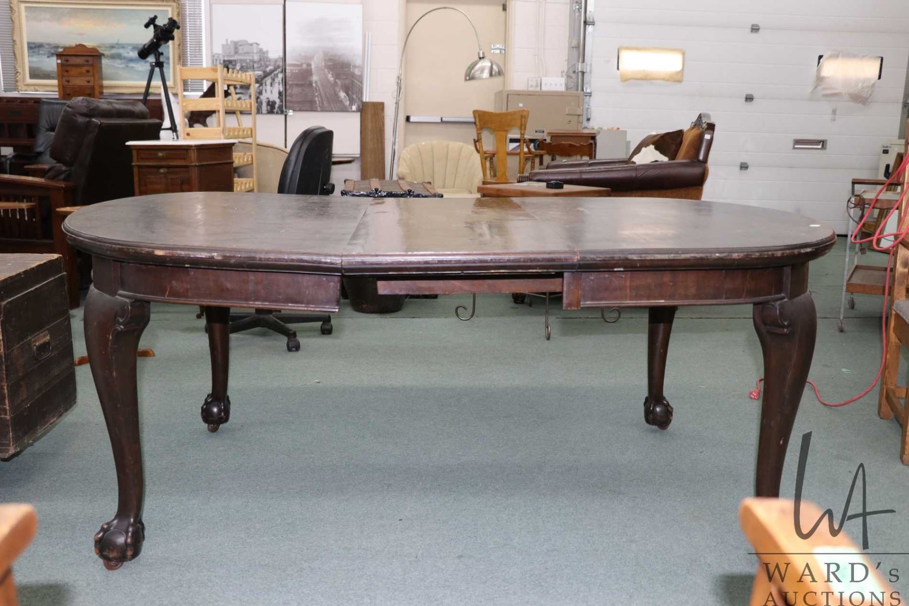 Antique mahogany crank table 48" X 52" plus one 17" insert leaf, with heavy ball and claw feet and i