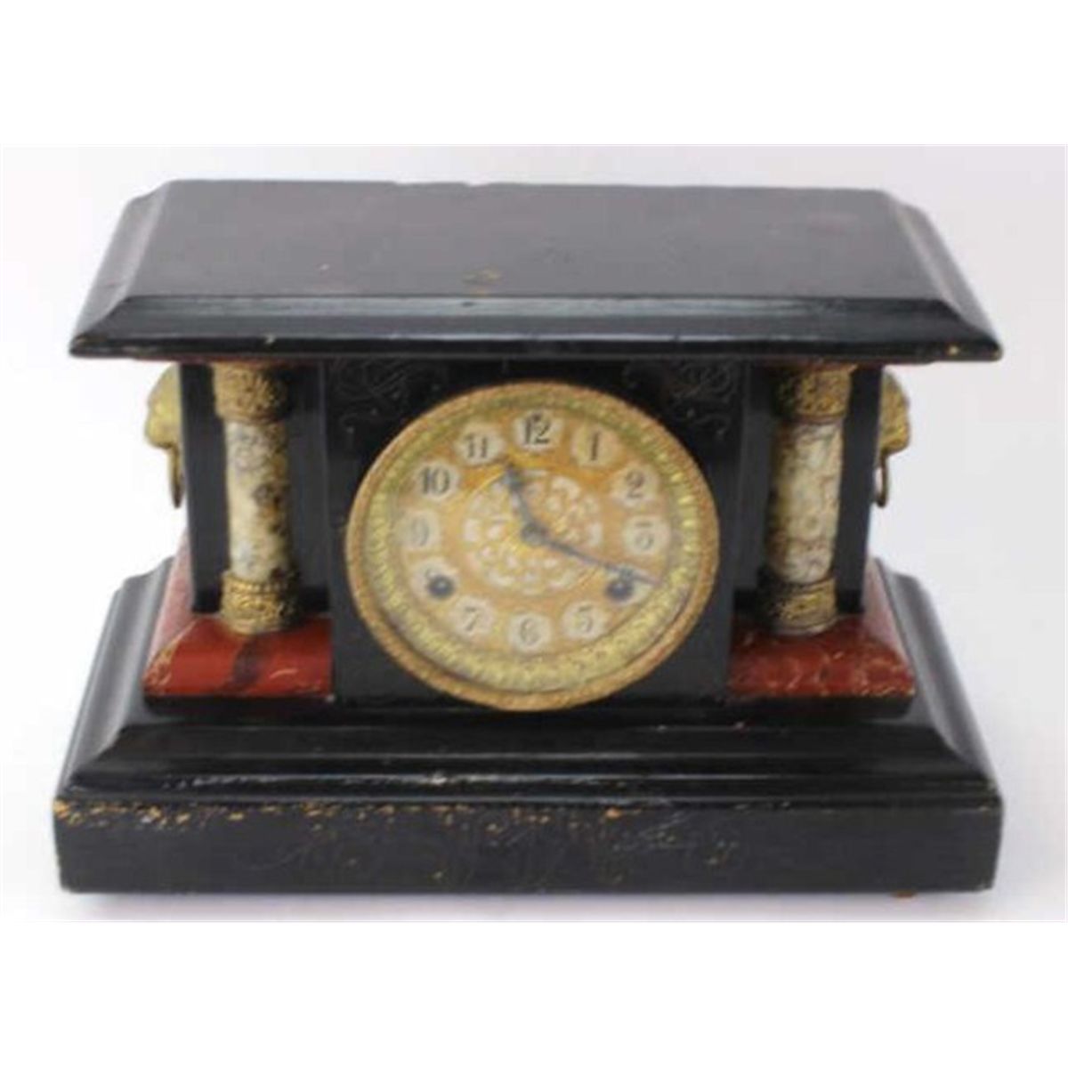 Antique mantle clock with black case and faux marble columns, lions head finials, includes key and i