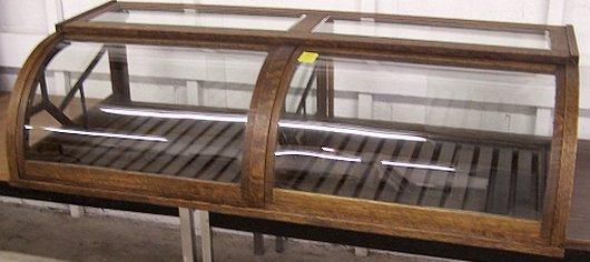quarter sawn oak, curved glass front doors open from rear by levers, beveled top glass original finish and slatted interior, 59" long X 26 1/2" wide X 16" tall.