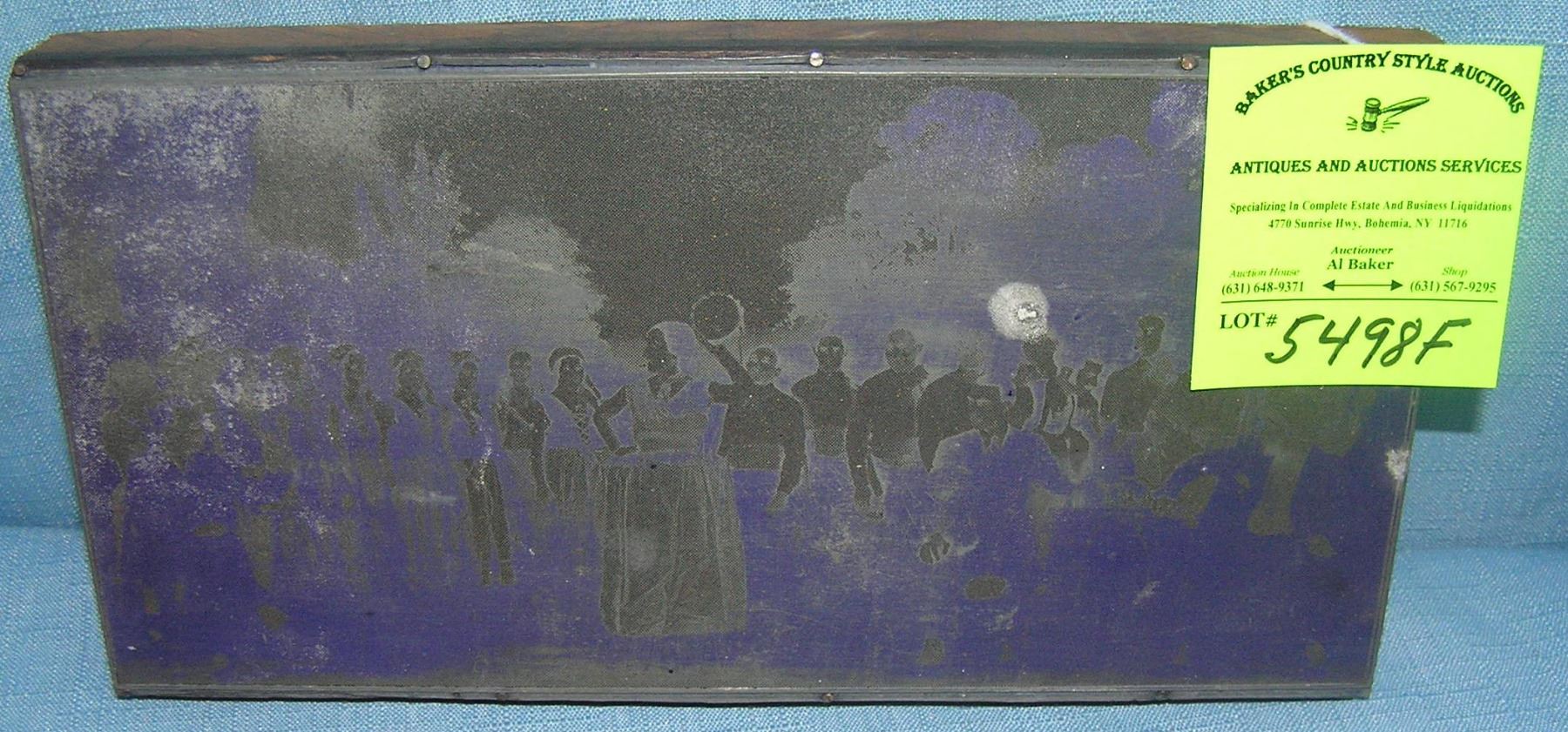 Antique metal and wood printers block plate image appears to be a festive gathering est. value $75.00-$100.00