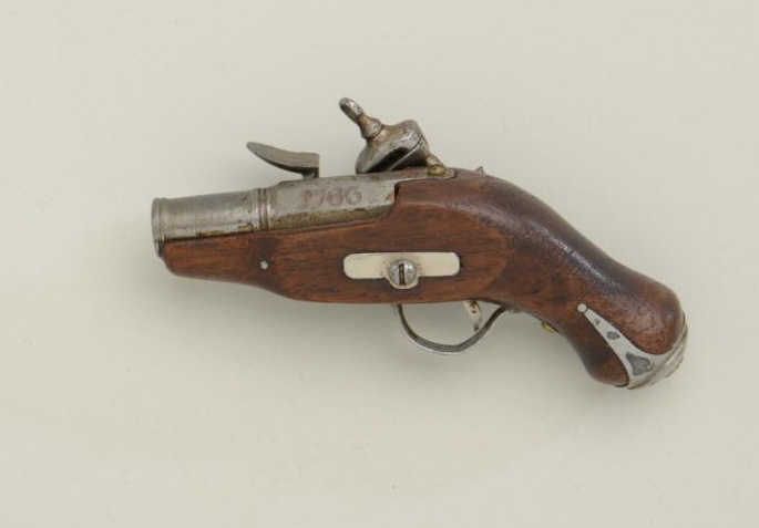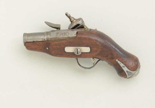 Antique miniature Spanish Miquelet flintlock fully functioning miniature pistol with barrel engraved and dated 1765. The pistol measures 3-1/2" overall, with 1-1/2" barrel of approx. .25 cal. The metal surfaces arenicely handmade and all correct in form and design, right down to the hammer which actually has a functioning top jaw and the mechanism is entirely complete, spring has just gone weak, otherwise it would work andpossibly shoot as the touch hole is drilled. The condition is good with some staining and erosion. This is an antique miniature and is the style of 1765, however, we believe it to be made in the 19th to early 20th century. Absolutely an antique miniature in an interesting style and form which is almost never encountered. Est.: $600-$1,200