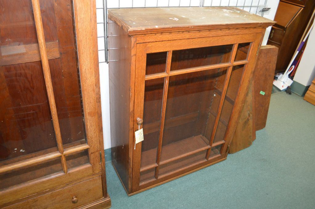 Antique oak and glass single door display unit, was probably the top to a now missing base, 44" in h