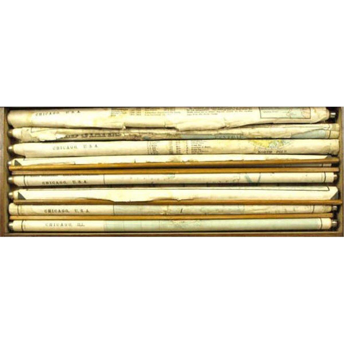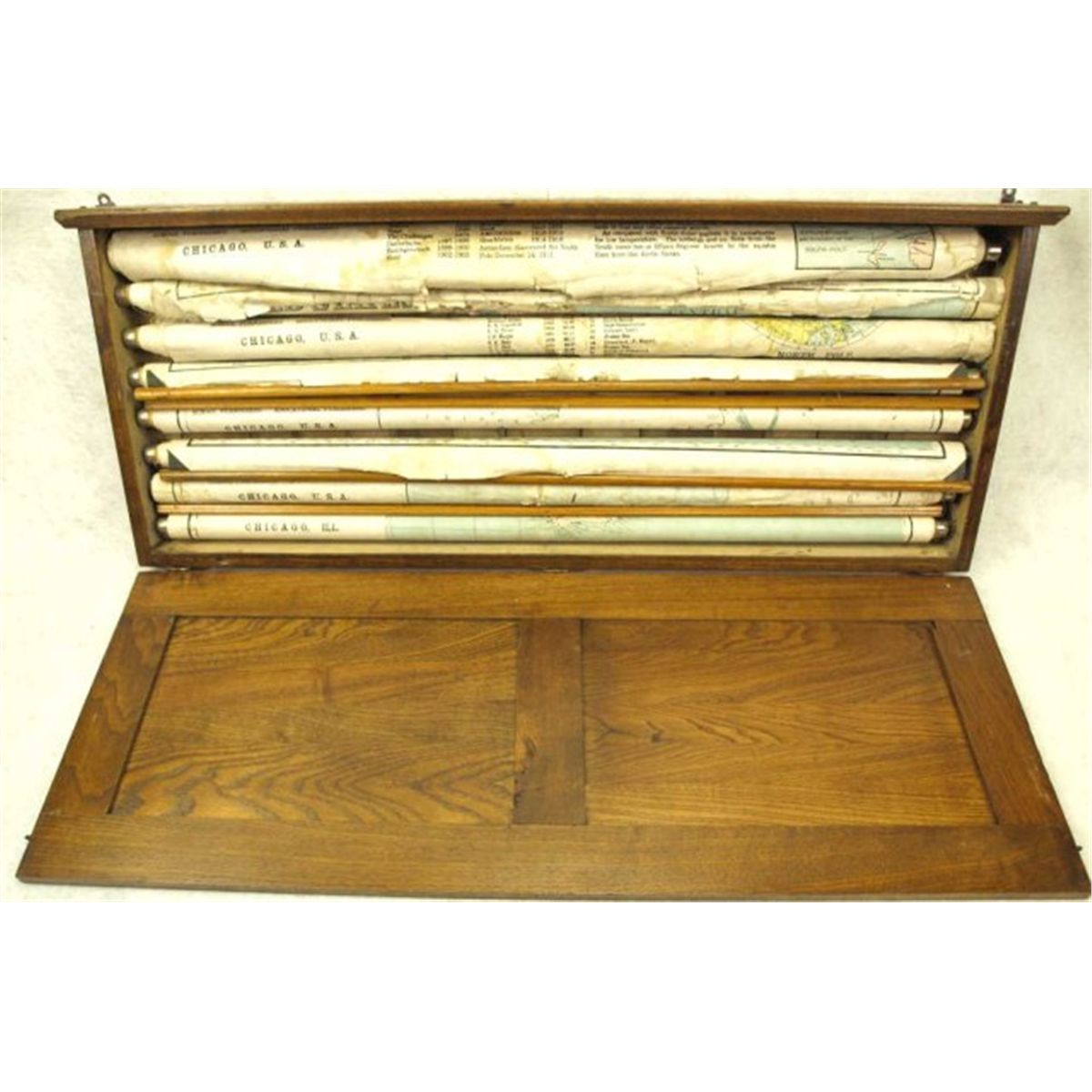 Antique oak cased map set with 8 pull down maps , 45" X 18" X 4".