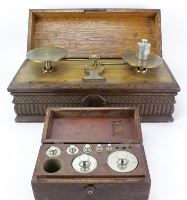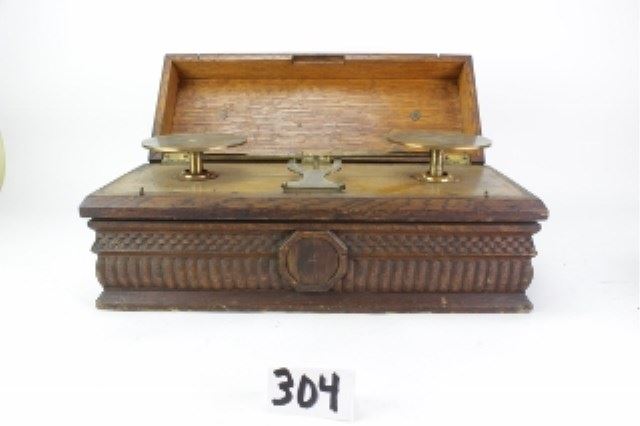 Troemner 19" long in working order with boxed set of 8 weights, three smallest missing. Great old set with wonderful patina. Est. 250-400
