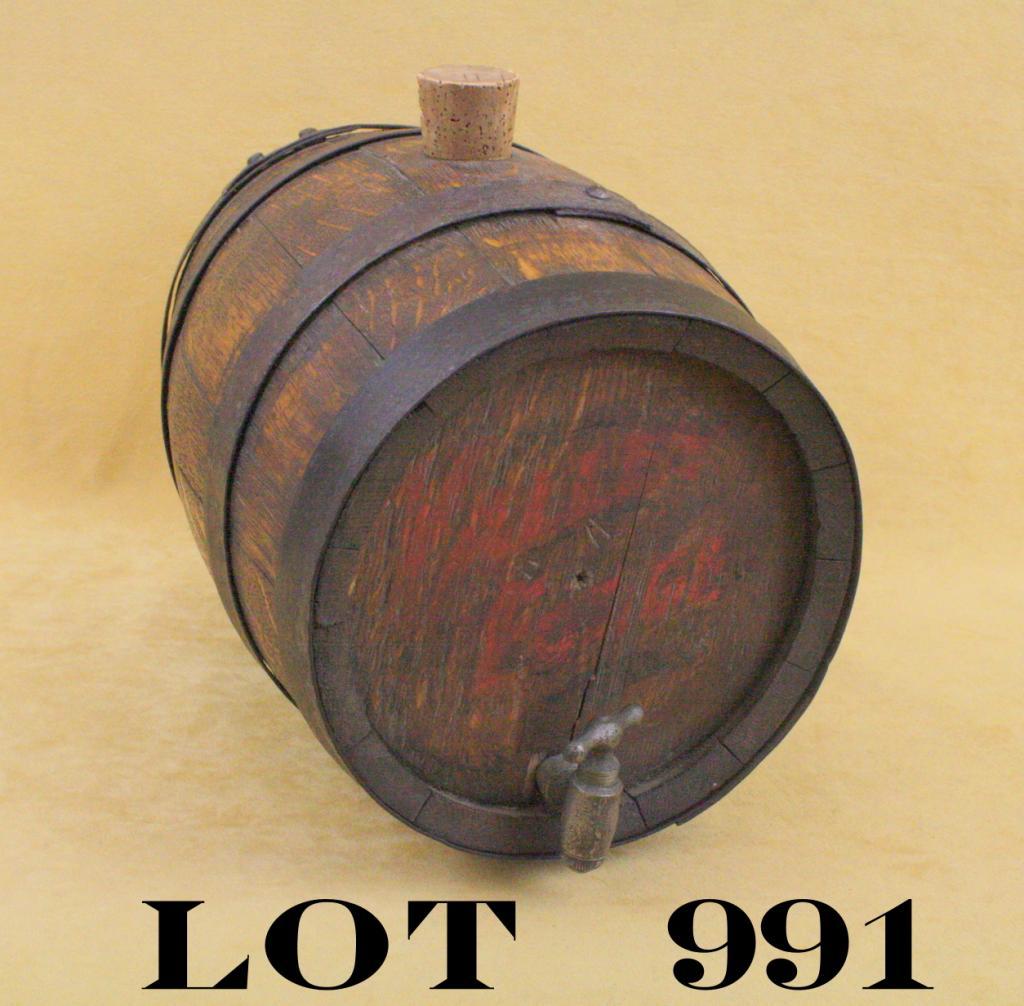 Antique oak keg with iron bands approx. 10” in length and approx. 7” in diameter with an old cast metal spigot in overall good condition showing years of use; a great decorator for the bar or for the collector of saloon ephemera. Est.: $75-$150.