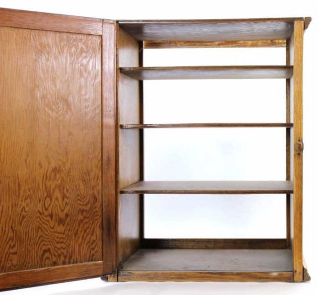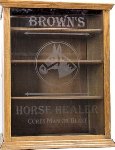 "Browns Horse Healer Cures Man or Beast", single hinging rear door, 3 interior shelves, 15" X 21" X 27", good overall condition.