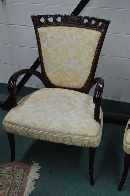 Antique open arm upholstered parlour chair with delicately carved supports and back decoration