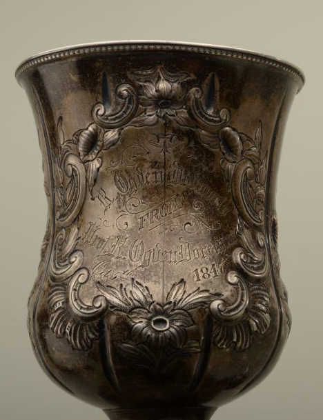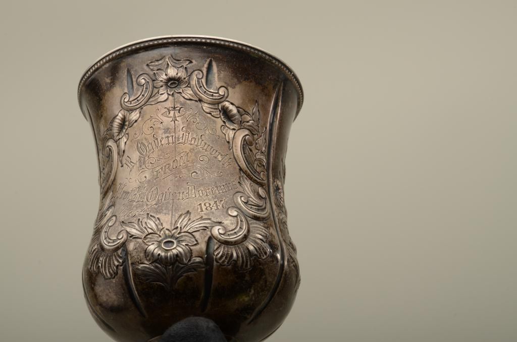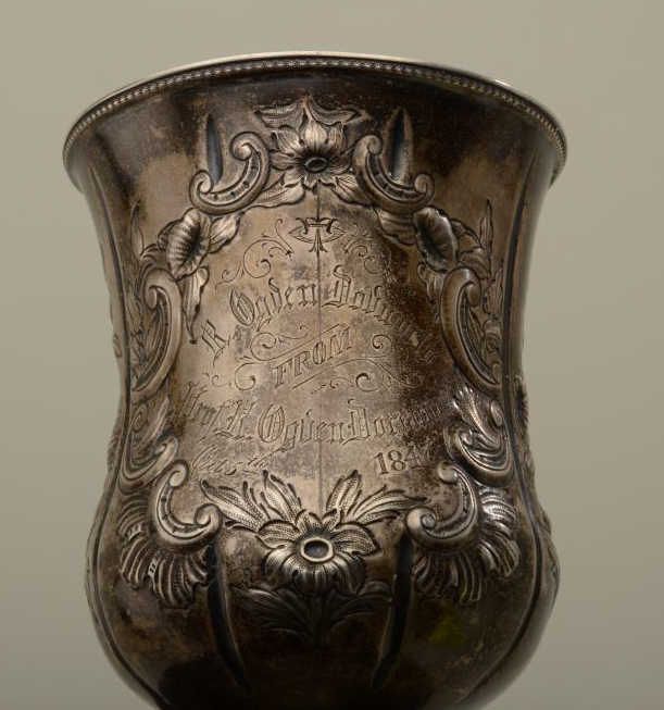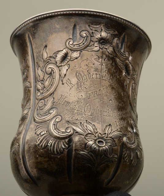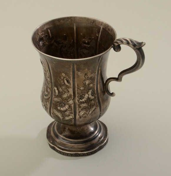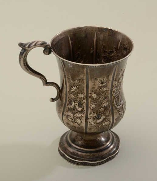 Antique ornate silver drinking cup approx. 5-1/2” in height with raised floral design and fancy handle; some minor old denting to base. Est.: $100-$200.