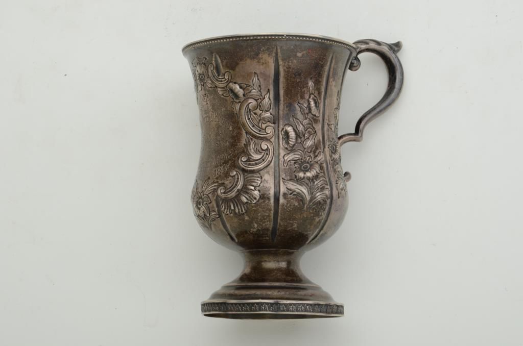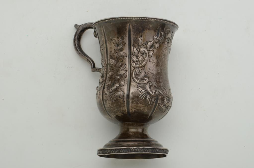 Antique ornate silver drinking cup approx. 5-1/2” in height with raised floral design and fancy handle; some minor old denting to base. Est.: $100-$200.