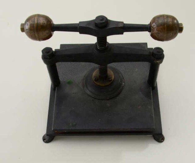 Antique page press for books in the 19th century. Good condition measures approx 12-1/2” in ht, by 14-1/2” across including base. Weights approx. 50 lbs. From the Robert Petersen Estate. Est.$150-$300