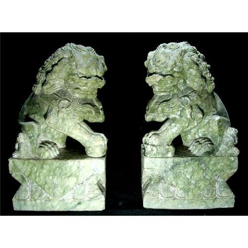 Antique pair of Chinese Fu Dogs. These mysthical beasts, who resemble lions, are a ubiquitous symbol in Chinese lore. Used to be located in the front of the house. The material is probably soapstone.