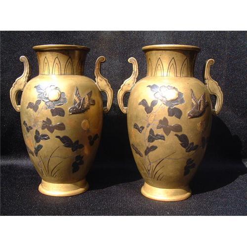 Antique Japanese bronze pair of vases decorated in bas relief with inlaid gold, shakudo and shibuichi hand decorations. It dates to second half of 19th. century, Meiji period. The obverse side is decorated with peony flower, buds made from inlaid gold and shakudo leaves. A flying bird has inlaid gold beak and wigs and shakudo body. The reverse side has flowers and leaves inlaid in shakudo, as well as shibuichi and gold inlaid in the flowers. This masterpiece of Japanese art is not signed. Estimated value: $4000.