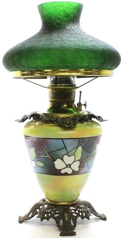 and green satin glass shade. Original burner with wick intact. Est. 250-500