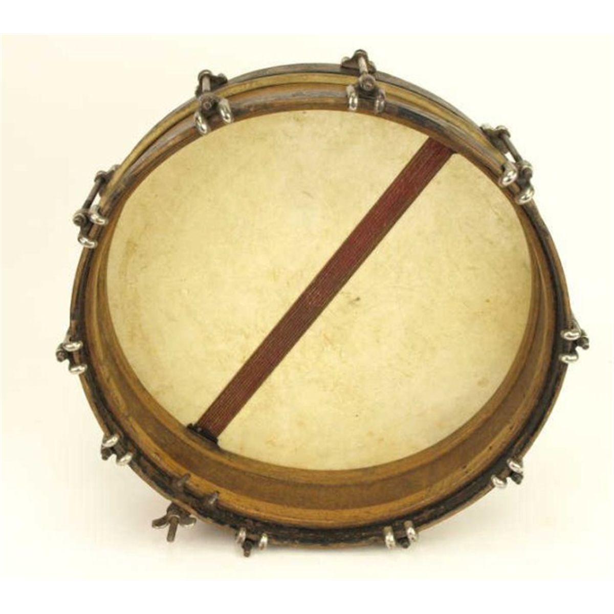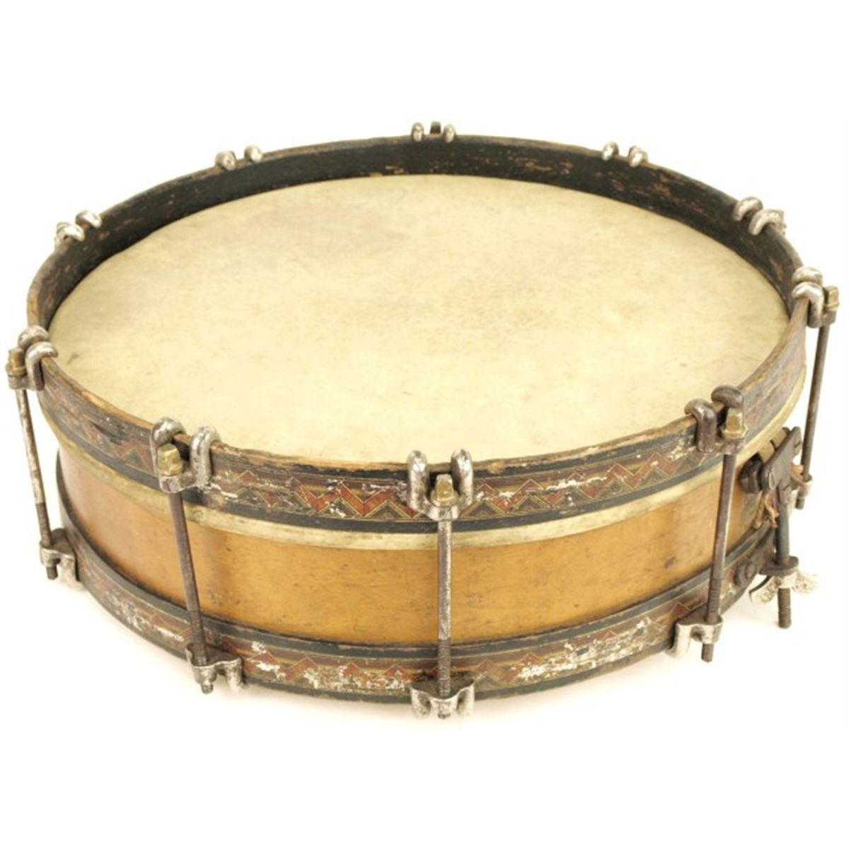 Antique percussion drum 14" diameter with metal hardware, unmarked, with geometric zigzag pattern to perimeter.