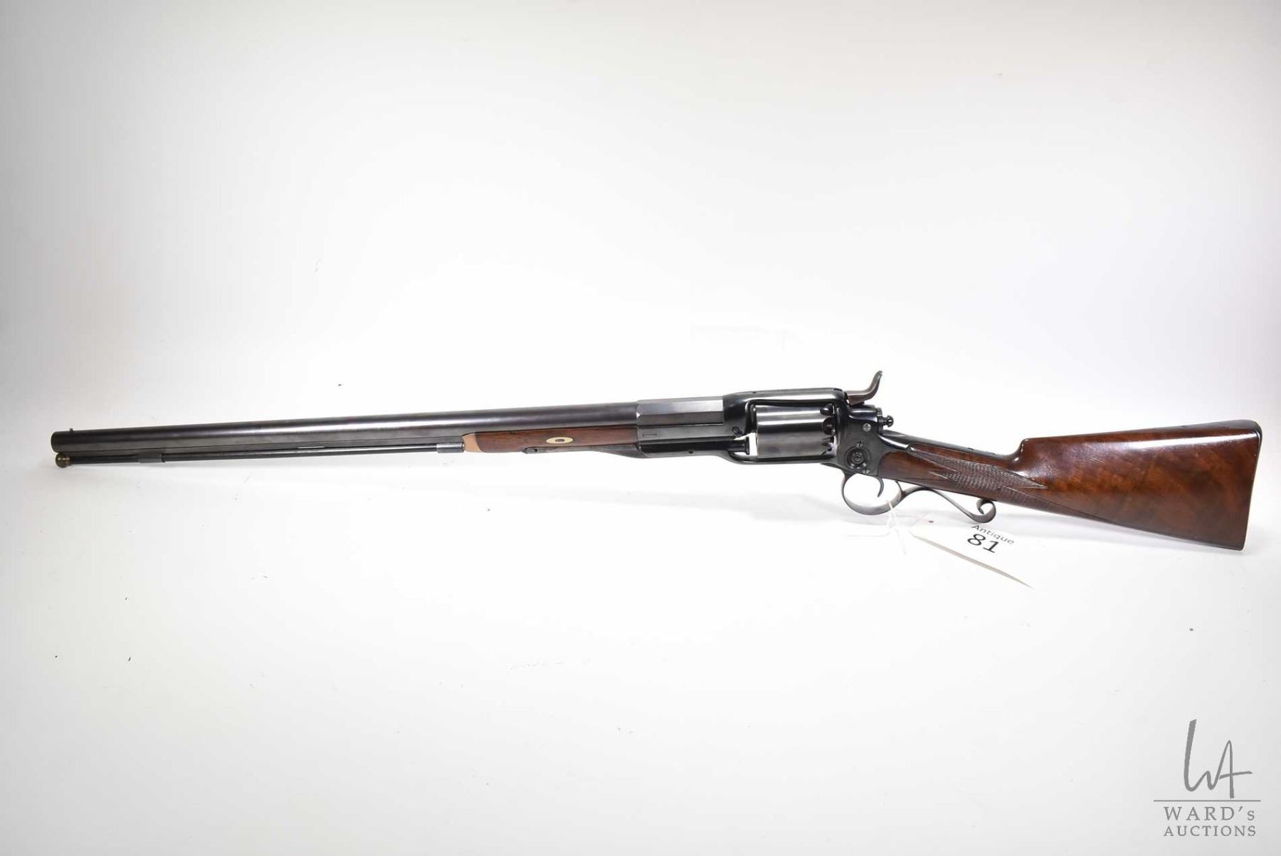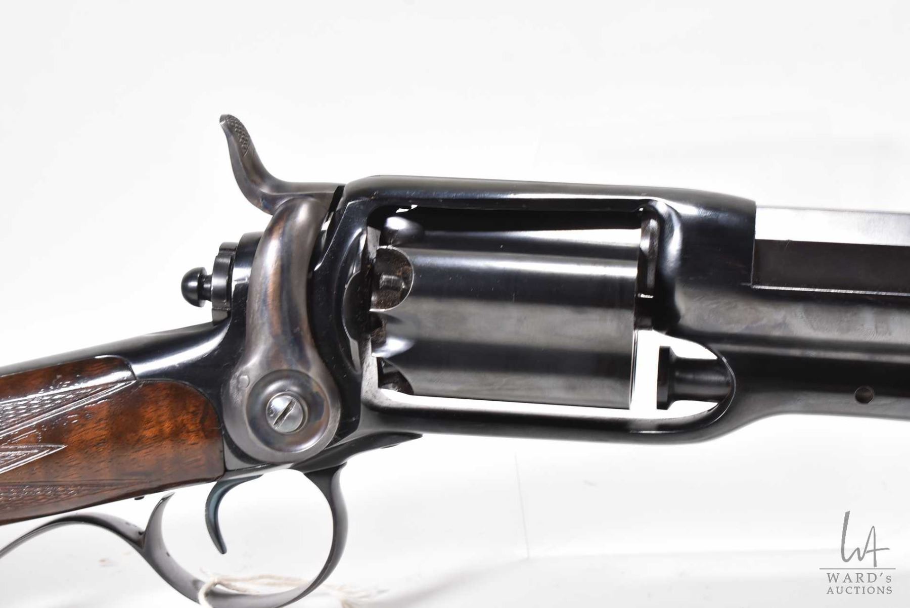 Antique percussion shotgun Colt model 1855 sidehammer, 10 gauge five shot single action, w/ bbl length 26.969" [Blued round barrel with semi-octagonal breach. Single bead sight. Walnut stock with metal butt plate. Fluted cylinder. Scroll type trigger guard. Appears to be completely restored including bluing and wood refinishing. Very little visible pitting under new finish. Cylinder does not always rotate during cocking. Attempts to remove cylinder for inspection found the cylinder access rod to have higher than inspected resistance to remove and inspection not complete. Center barrel rod ring detached from under lug. 19.69mm Bore] serial # 957, No PAL required
