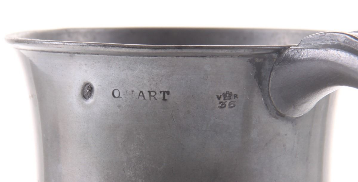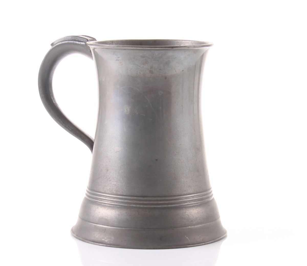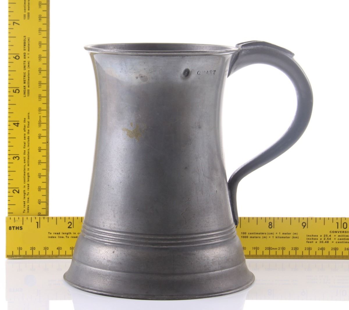 Antique pewter quart size mug with Maker Hallmarks. Estimated more than 100 yrs old. (Pangaea Auctions) Size: See Ruler Photo. (Photos Represent The Condition Of The Lot.)