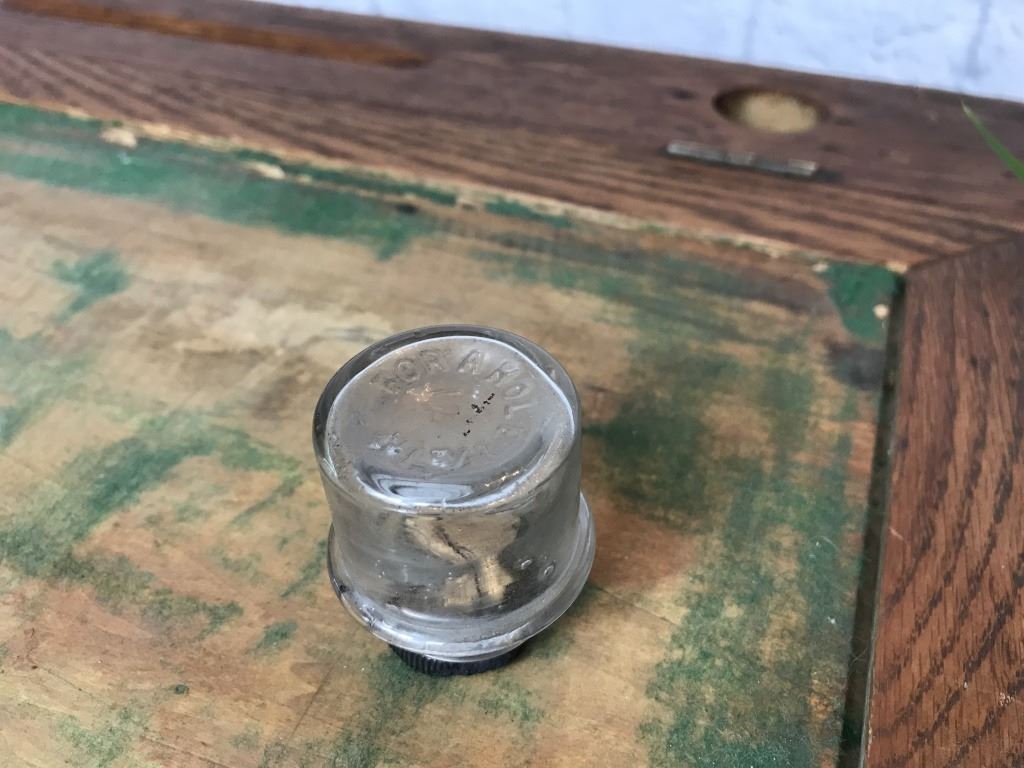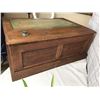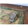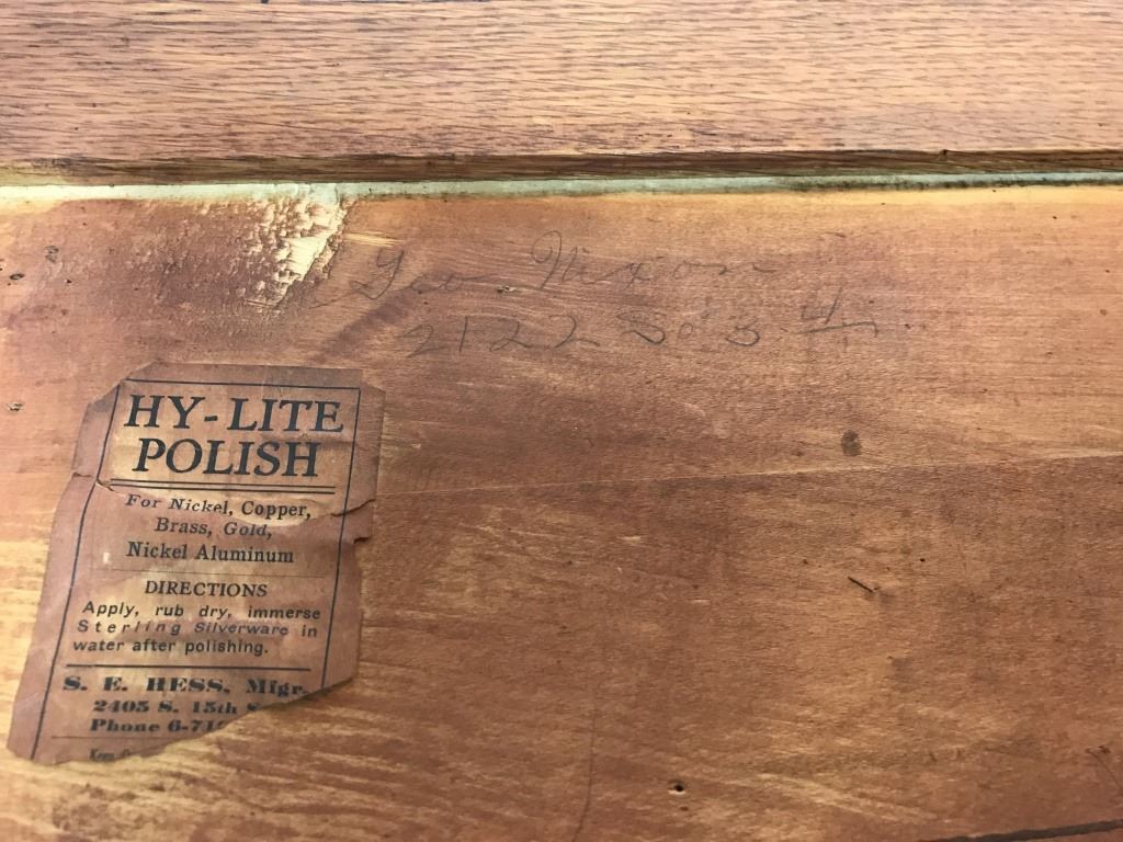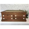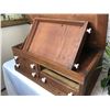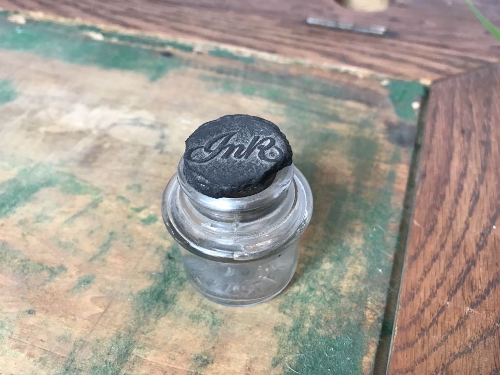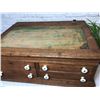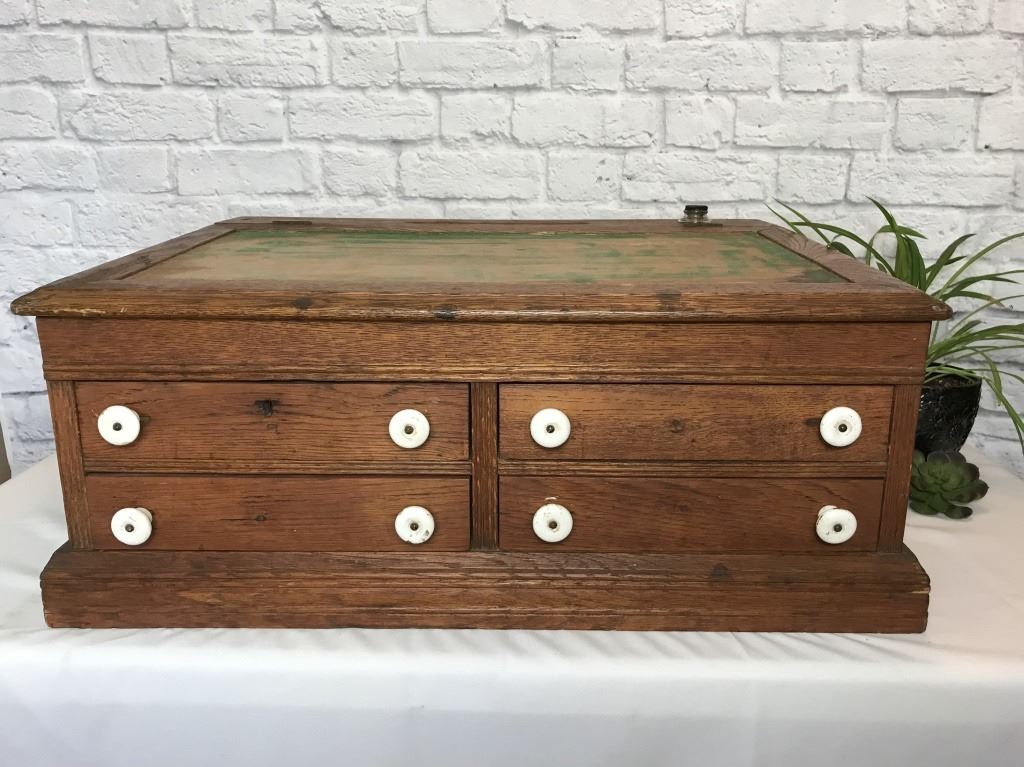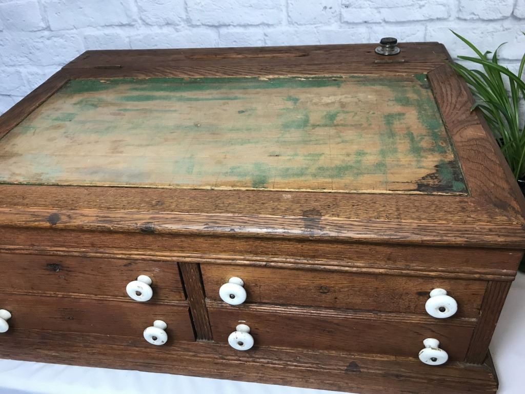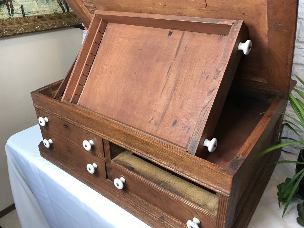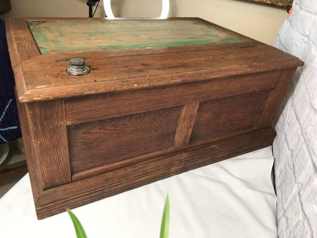 28 ½ wide by 20 deep by 12 high, four drawers, complete with the original ink bottle. Hand written date May 6, 1920 on the inside of the lid.