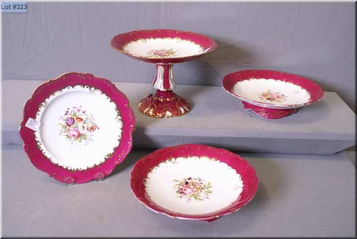 Antique porcelain dessert set with handle painted detail and gilt decoration including comport, two footed plates, etc