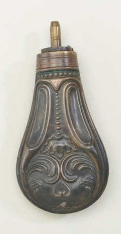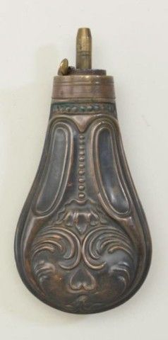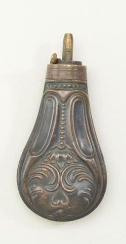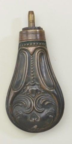 Antique powder flask of American style type found with medium to large frame revolvers and pistols circa 1850-1860's. The flask shows an embossed body with leave design, measures approx 6" from tip to end and 2-7/8" across its narrowed body. Condition good to very good. The spout measures nearly 1" for 36 caliber or bigger pistol. Est.;$125-$250.