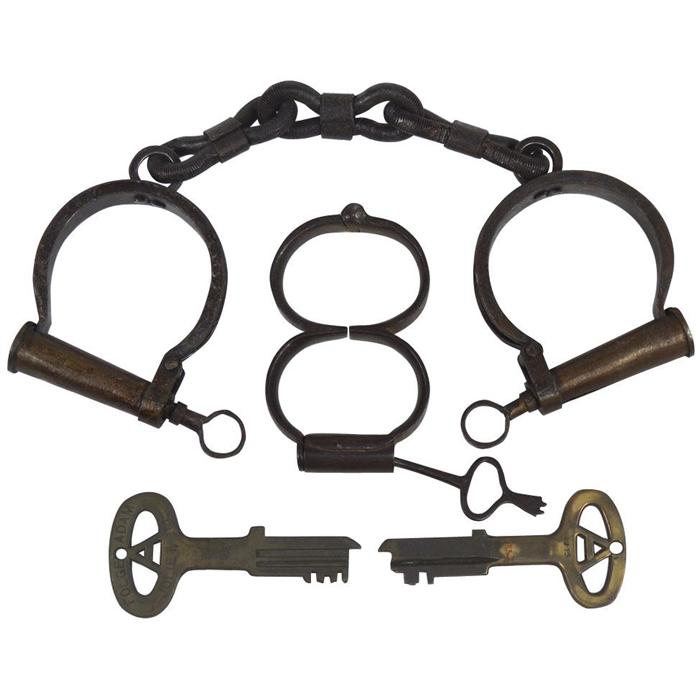 Antique pr of handcuffs w/keys & 2 jail keys from Joliet Jail, early 1900's, Good to VG cond.