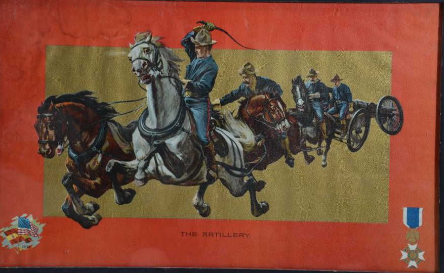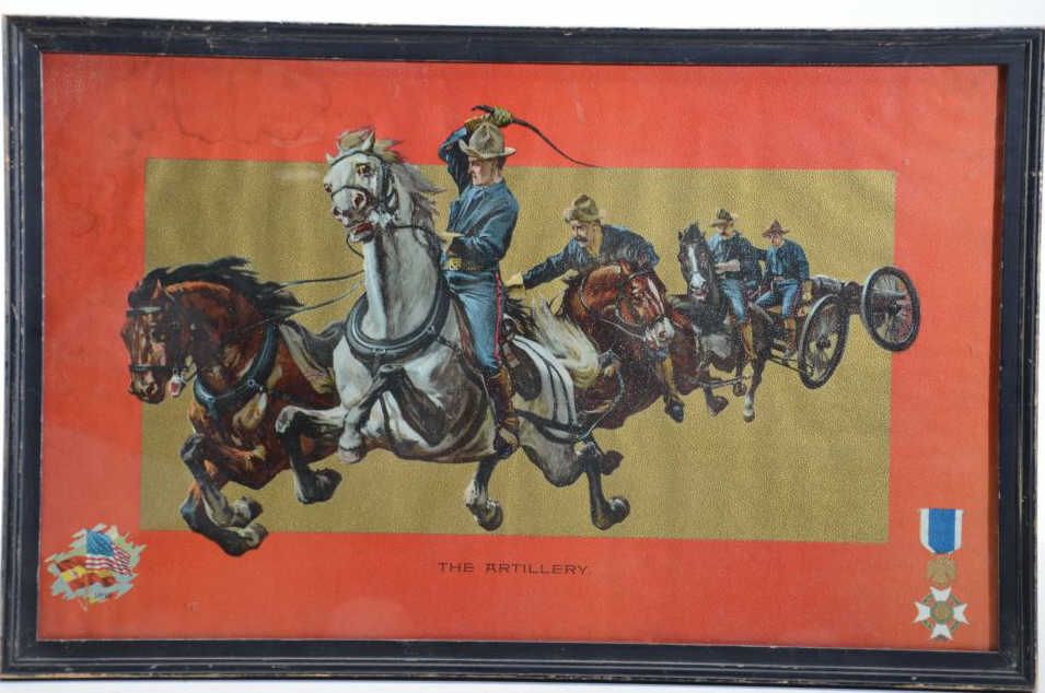 Antique print entitled "The Artillery", showing flags and 1898 lower left, medal in right corner; some staining, old frame, fair condition. Est.: $50-$100