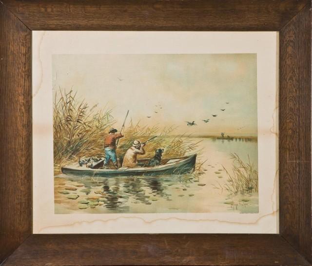 Antique print in wood frame showing hunters by Hugo Fisher. Copyright 1895 by J. Hoover, Philad’a. Needs some conservation. Frame shows some slight damage and aging, but generally good. From the Robert Petersen Collection. Est: $150 - 300