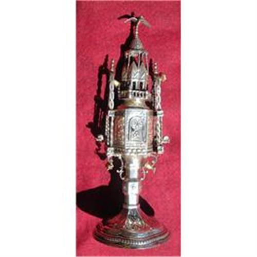 19th.-20th. pure silver large spice tower decorated with 4 gilded bells and a flying bird on top. The container has 2 lions at the base of the tower container and decorated in high and low relief. It is marked on the bottom 999 Smarak and is very heavy. Above the spice container, there is a 6 sided view terrace and a multiple doors interior. This is the most unusual spice tower we have ever seen, both of monumental proportions and weight. A research of this item shows that it was created in Maharashtra, India, probably in Cochin, by a master silversmith. The design combines the Islamic design on the terrace above the spice container reminding a muezzin pavilion terrace, Buddhist influence on the lotus leaves-like decorations above the terrace design and Christian-pagan influence represented by 2 lions at the base of the tower and the flying bird on top of the tower. Estimated value: $5.000.