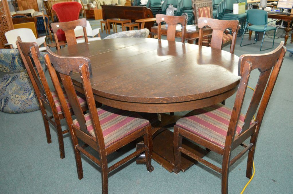 Antique quarter cut oak 48" diameter round dining table with two skirted leafs and two non skirted leafs plus six oak t-back non Empire style dining chairs