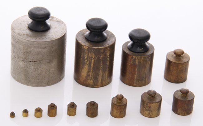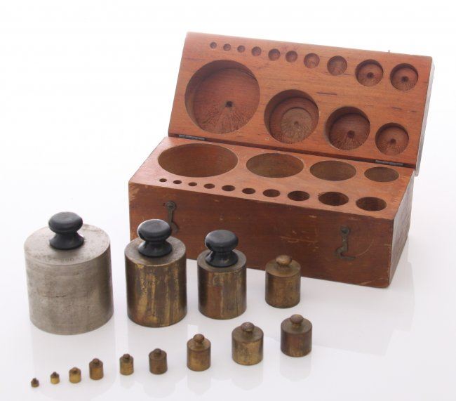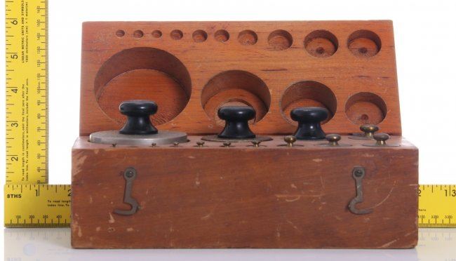 Antique scale weights with original box. SIZE: see attached ruler photo. Photos are part of the description representing the condition report and can be used for authentication prior to the sale date. Pangaea Auctions urges Bidder's to view all attached photos in detail.