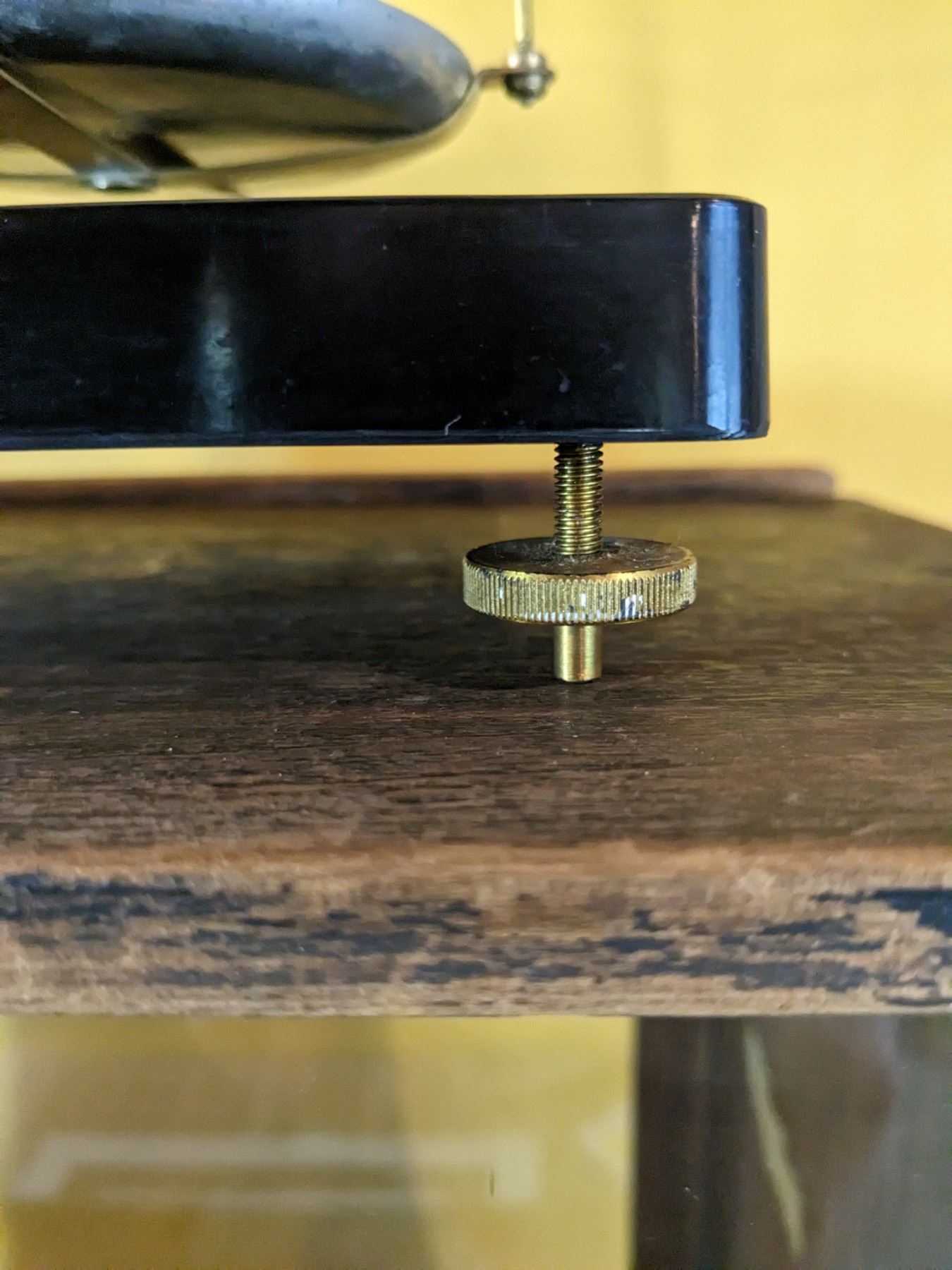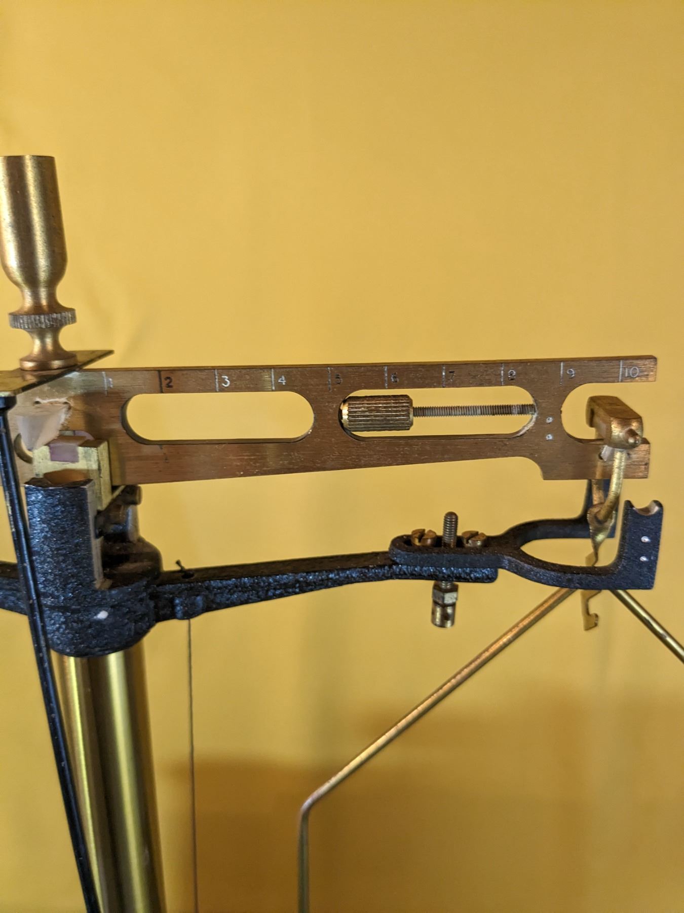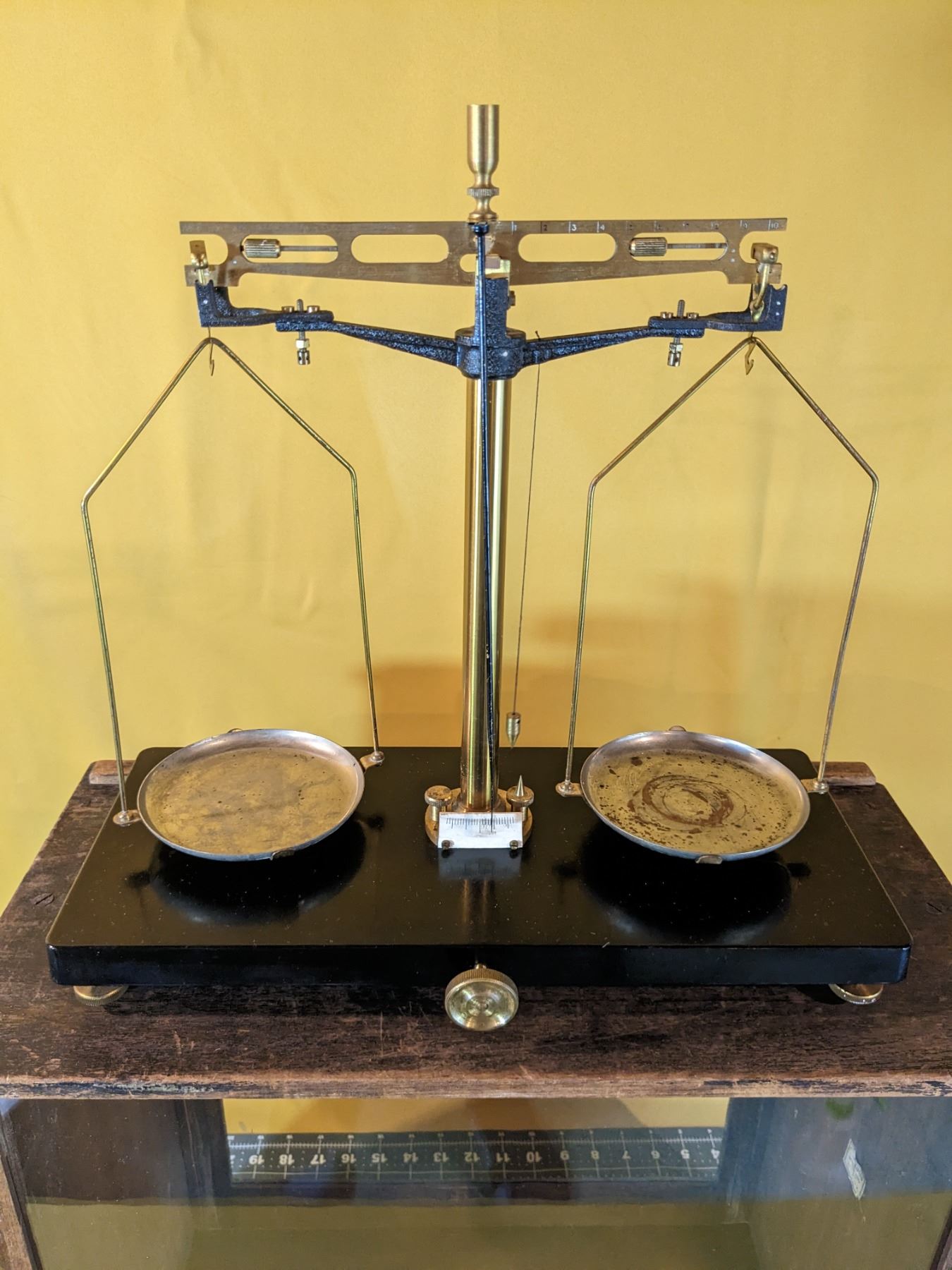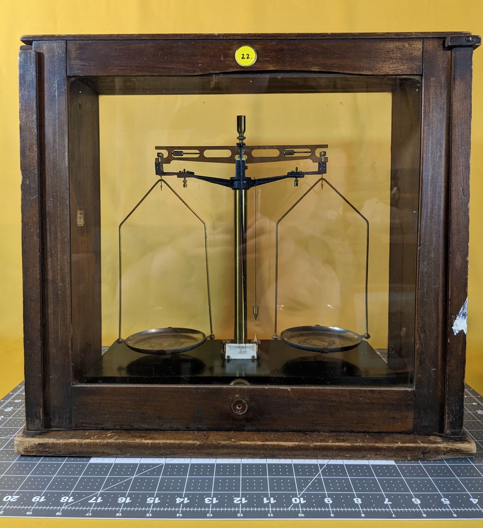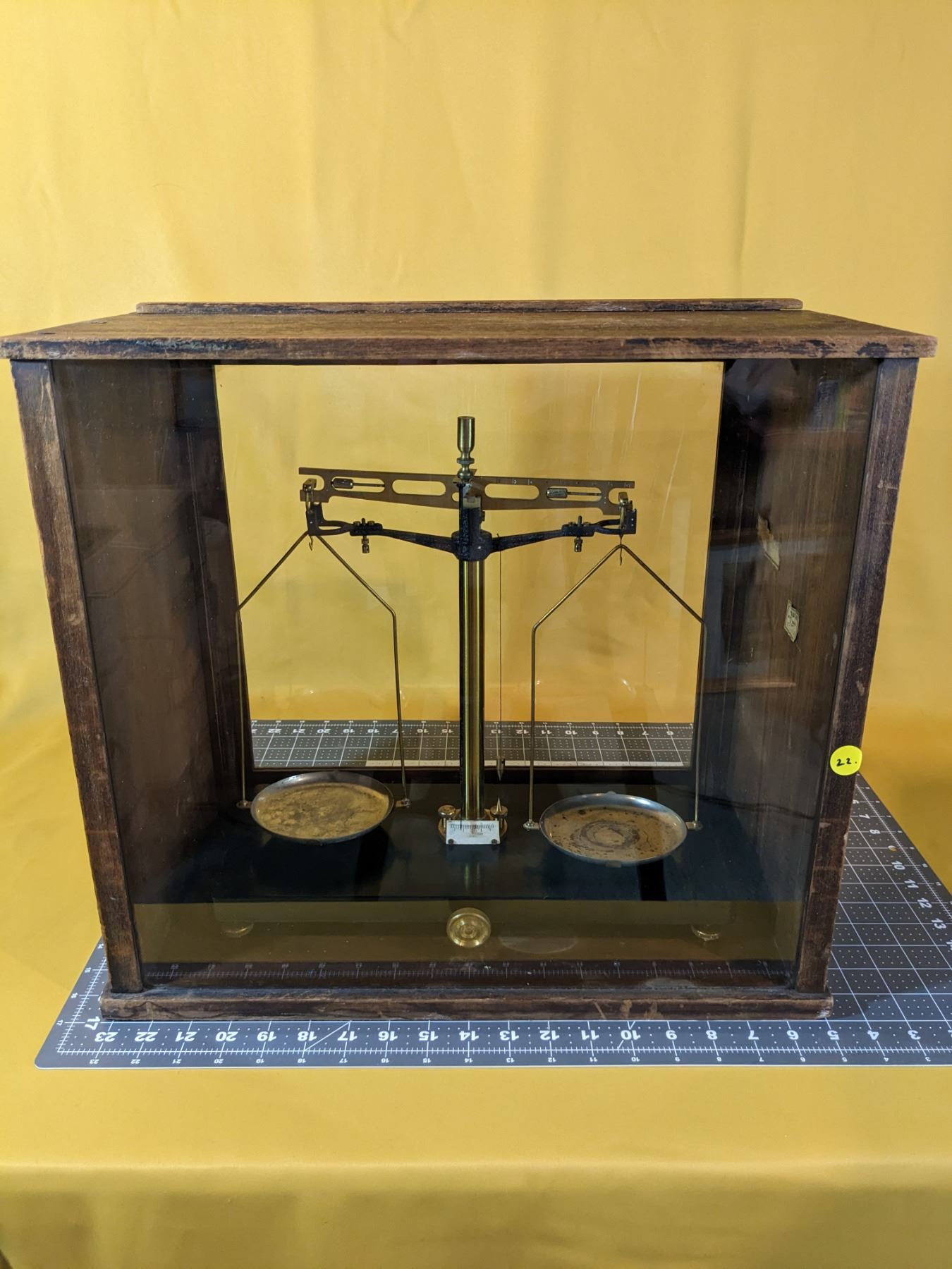 Antique scales, 1930s, in glass and wood case. Works. Glass case 18 in x 18 in.