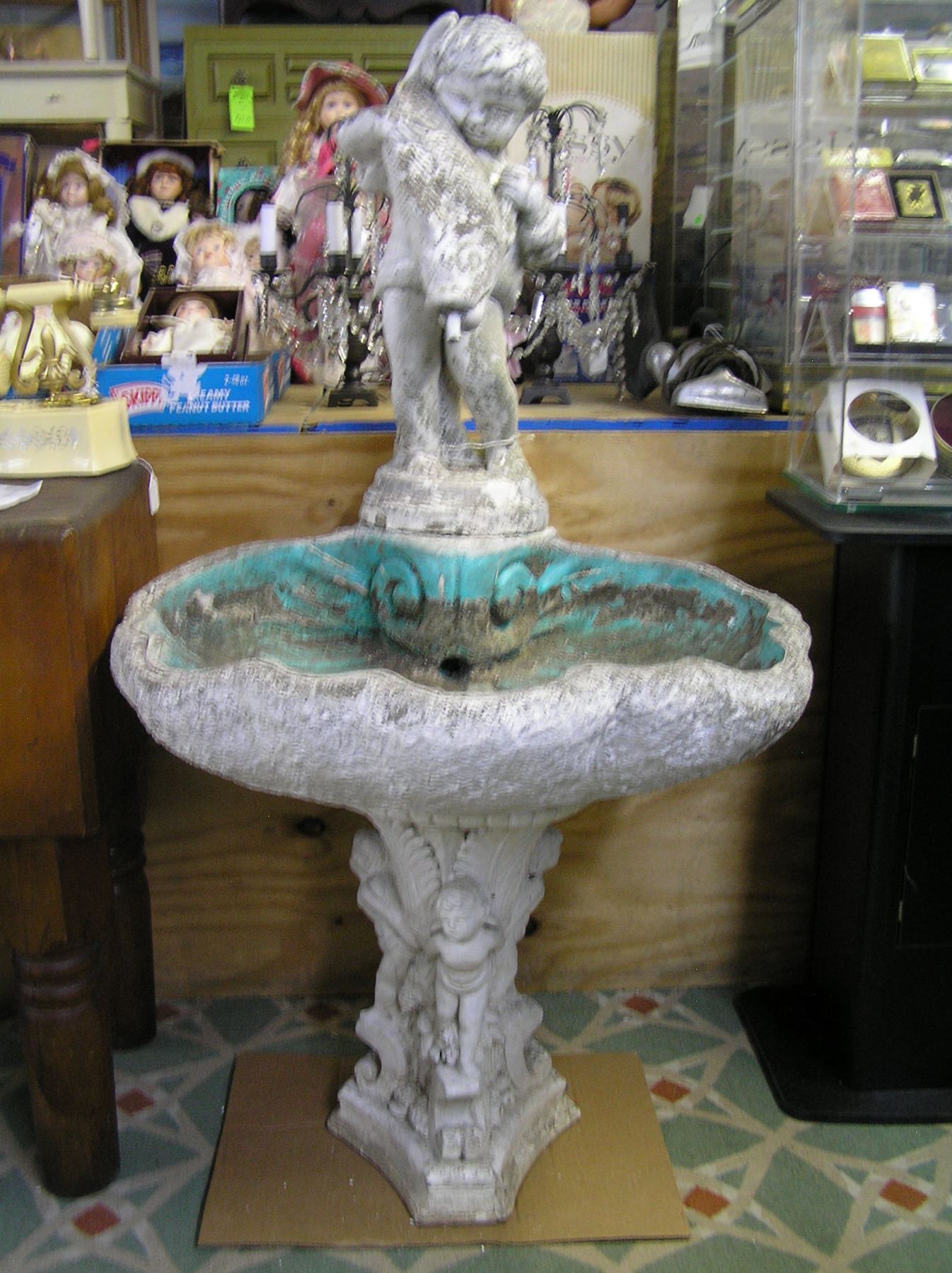 Antique seashell shaped bird bath with large putti figure holding fish that disperses flowing water through his mouth, base has a series of four putti figures as well, original water pump included 1930’s est. value $1200.00-$1500.00