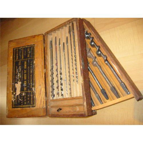 This toolset is very decorative, and collectible. The tools are in a wood box with two compartments. Lables are on the interior from Irwin Auger Bit Comapny in Wilmington, Ohio. This tool set is very attractive and wood make a nice father's day present. It is in fair antique condition.