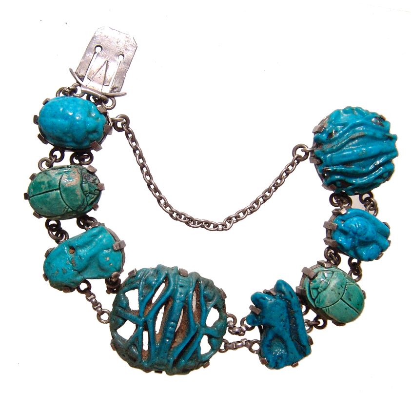 A beautiful antique silver bracelet set with amulets & scarabs. Each piece is in superb condition with vibrant blue to green glaze and includes a pair of New Kingdom scarabs, c. 1570 - 1075 BC, a Late Period faience scarab, c. 664 - 30 BC, and several 3rd Intermediate - Late Period Eye or Horus amulets, one a choice quadruple example. Largest amulet (quadruple Wedjat) measures 2.6 x 2.4 cm. A handsome bracelet with fully functioning clasp with safety chain. Ex Gloucestershire, UK private collection