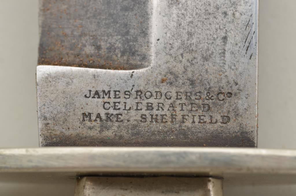 Antique spear point Bowie knife with heavy leather sheath approx. 12” overall with a 7-1/2” blade marked “Cast Steel Bowie Knife” in oval on blade, “James Rodgers & Co. Celebrated Make. Sheffield” on ricasso and partially visible etching “ . . . . . . at hand”. The knife is in overall good condition with a grey patina, scattered staining and pinprick pitting on the blade, clear markings, partially visible etching as previously noted; simple cross guard, six pinned dark horn scales on the grip with elongated pierced plaque; plain grip mount; sheath is overall good and made of thick harness leather with sinew stitching; scroll initials “FY” appear on the front of the piece. A substantial spear point by a well-recognized maker. Ex-George Taylor collection. Est.: $2,500-$5,000.