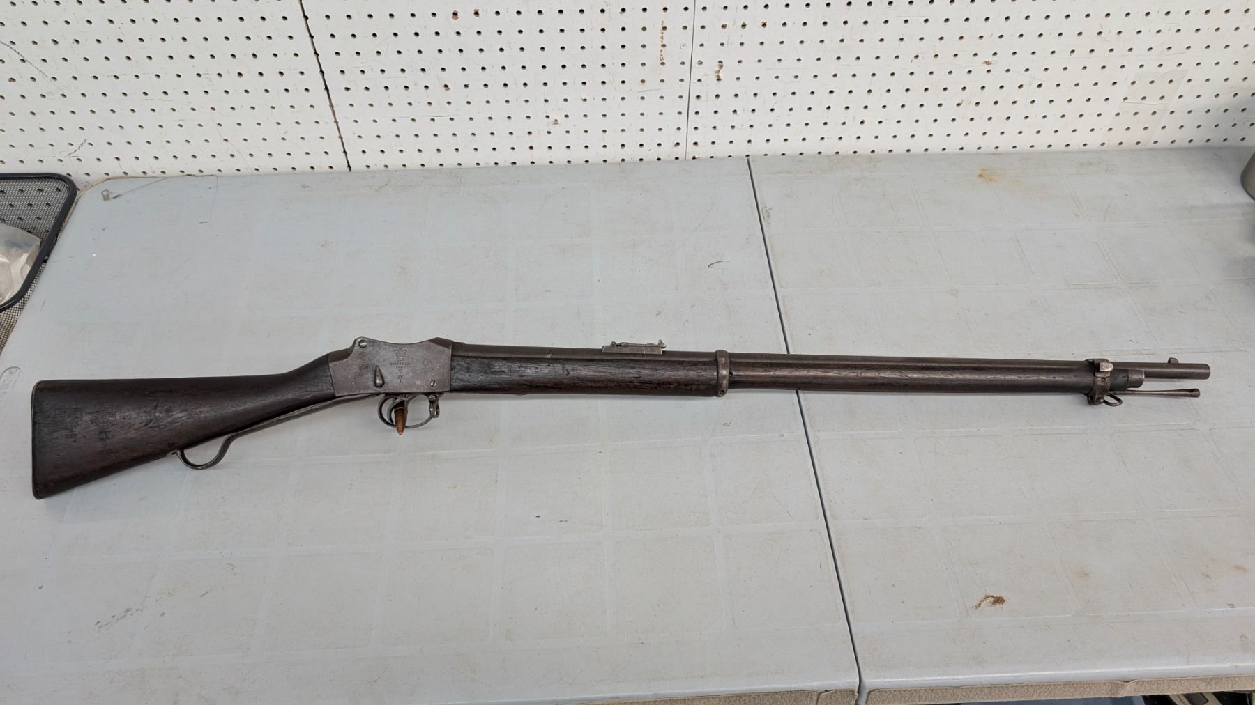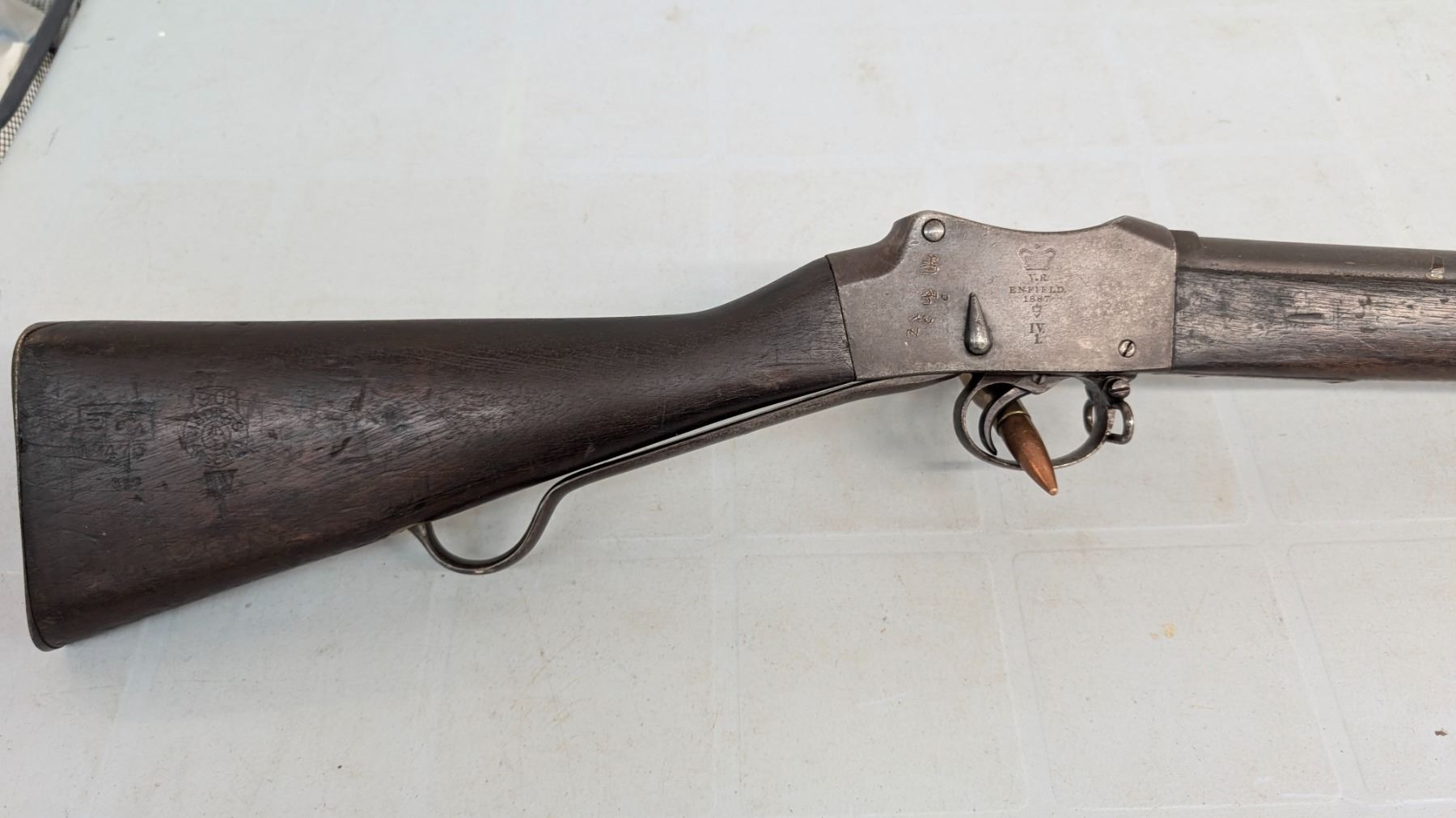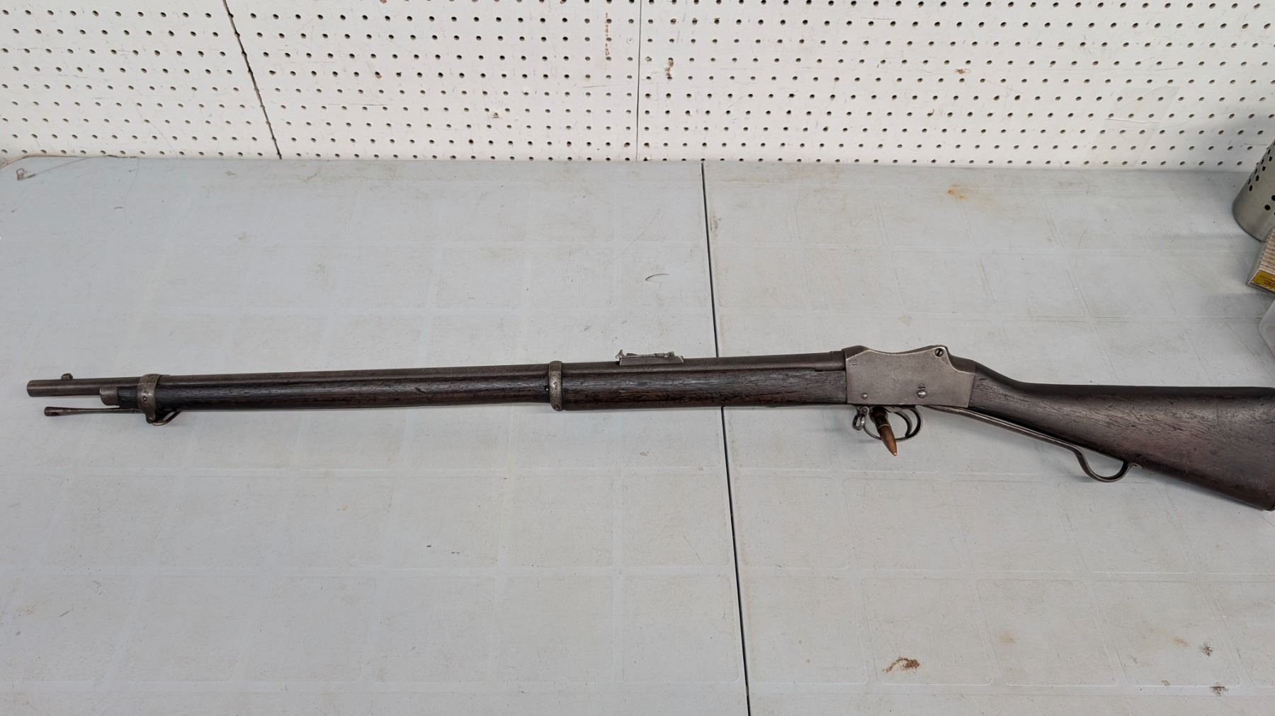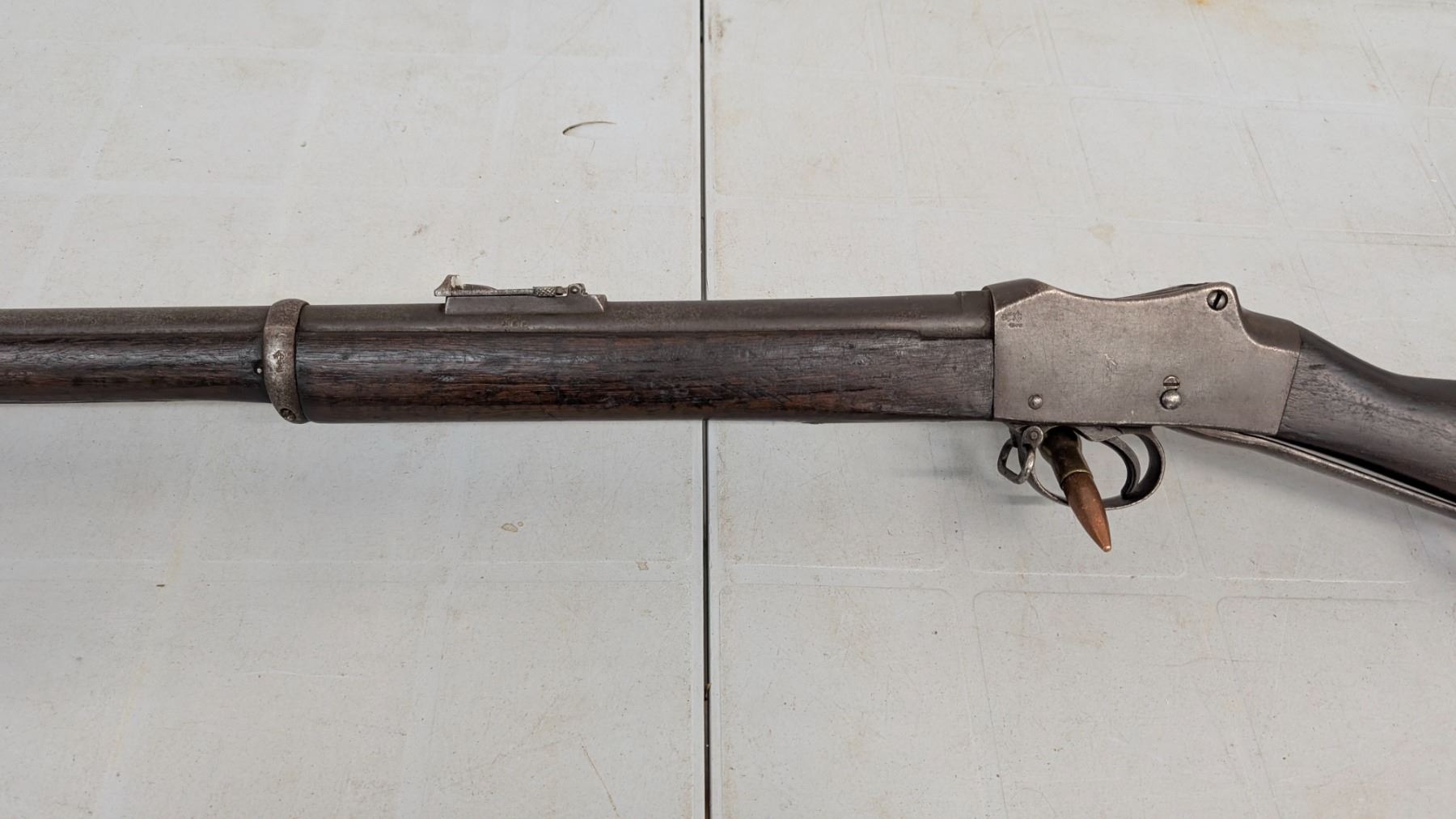 Antique status lever action falling block. Sharp rifling, good bore. 20% of blue finish remains. Action functions flawlessly. Stocks are in excellent condition. Various military acceptance stamps on stock including Hindu, Some Hindu stamping on metal as well.
