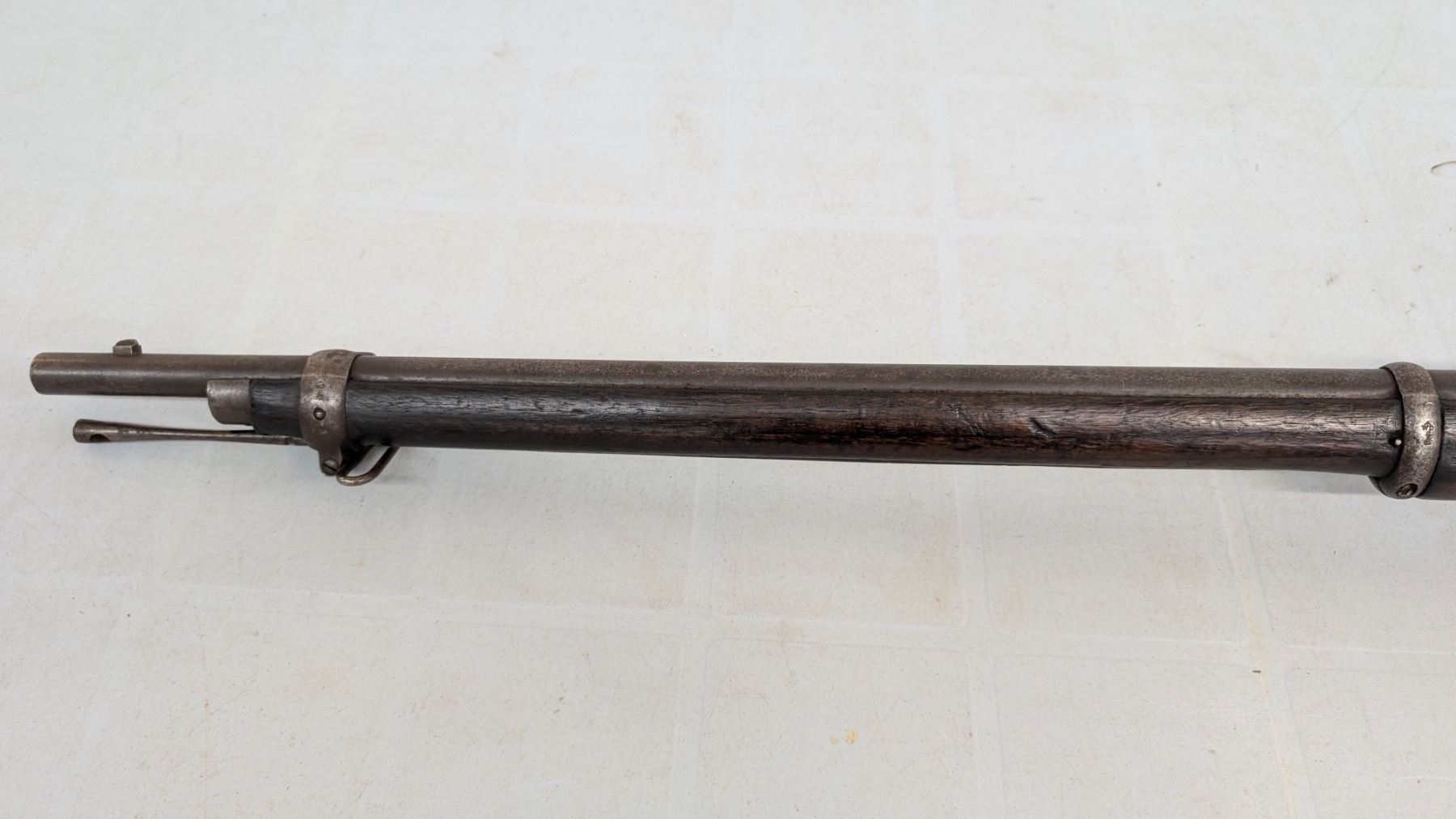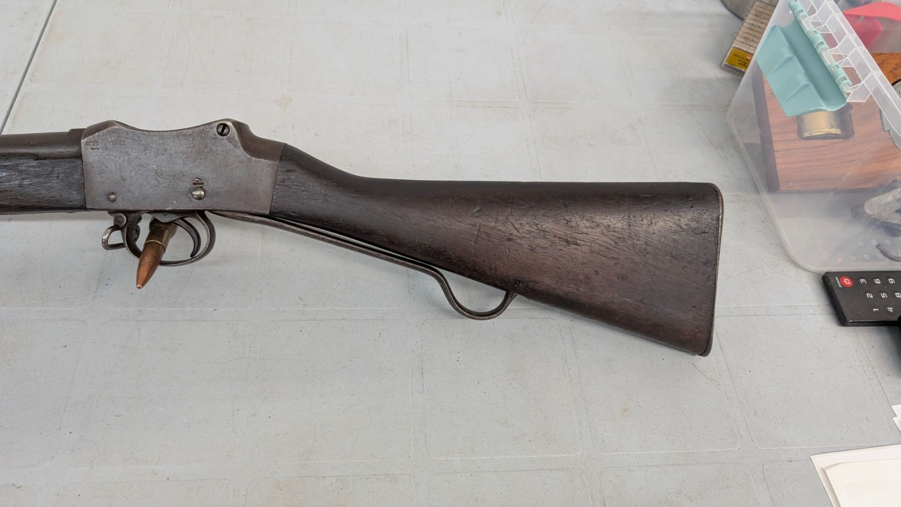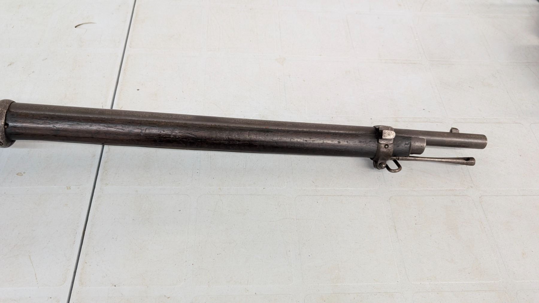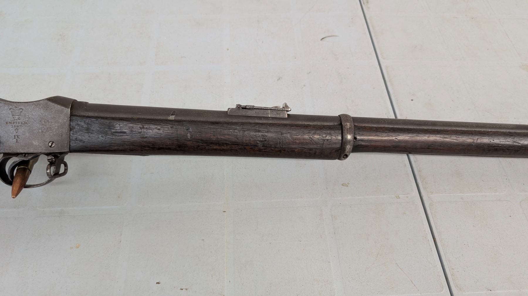 Antique status lever action falling block. Sharp rifling, good bore. 20% of blue finish remains. Action functions flawlessly. Stocks are in excellent condition. Various military acceptance stamps on stock including Hindu, Some Hindu stamping on metal as well.