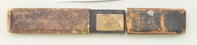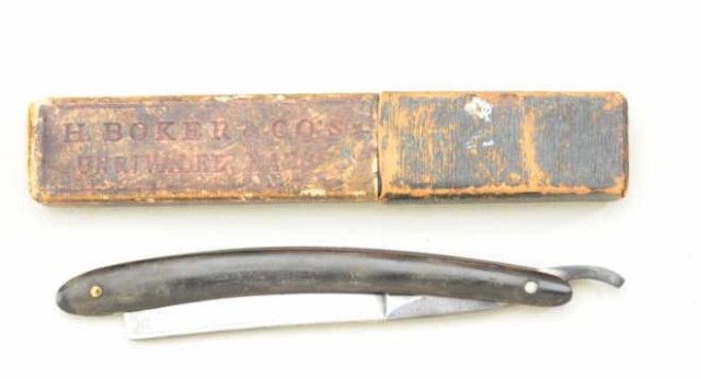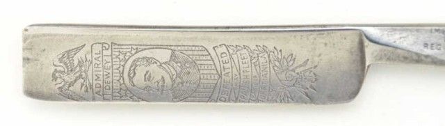 Antique straight razor by Imperial of Germany showing portrait of Admiral Dewey and legend defeated Spanish fleet off of Manilla May 1898. Blade very good, horn grips good, in original box also showing Dewey portrait andH. Boker & Co. mfg. of imperial razors logos. Est.; $150-$300.