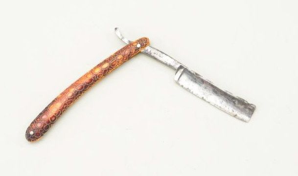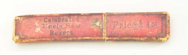 Antique straight razor by Moshy & Rahaim of Germany with desirable Uncle Sam portrait and etching on blade with correct original marked box. The body of the grip is marked "D.W.W. 1889" who was most probably theoriginal owner. The blade is good with most etching, just normal aging, one grip scale is cracked. The box is good but ends opening. Est.; $125-$250.