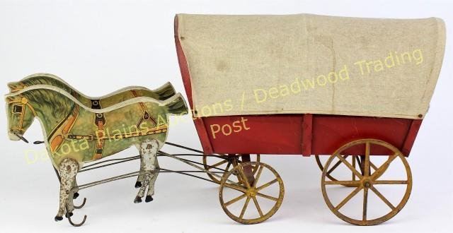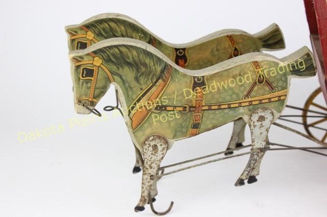 Antique toy wagon and horses made by Gibbs, No. 57 in near fine condition, NO repairs, 18 1/2" long.