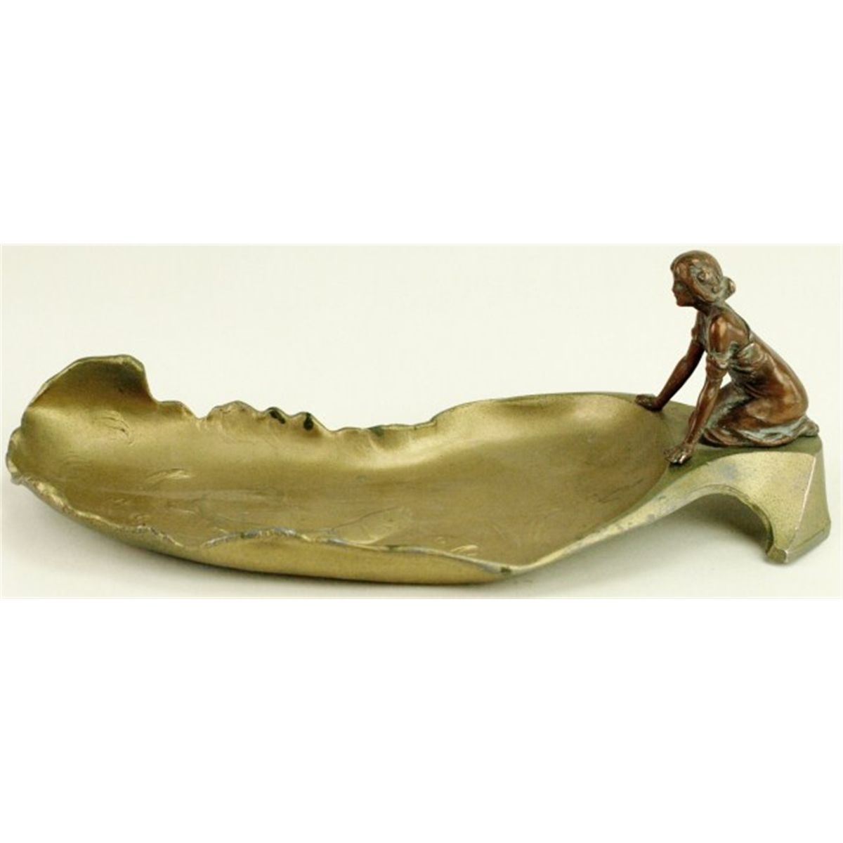Antique tray with copper figural maiden bottom of tray raised relief fish, marked to bottom 1647, 11" long. Remain excellent original condition.