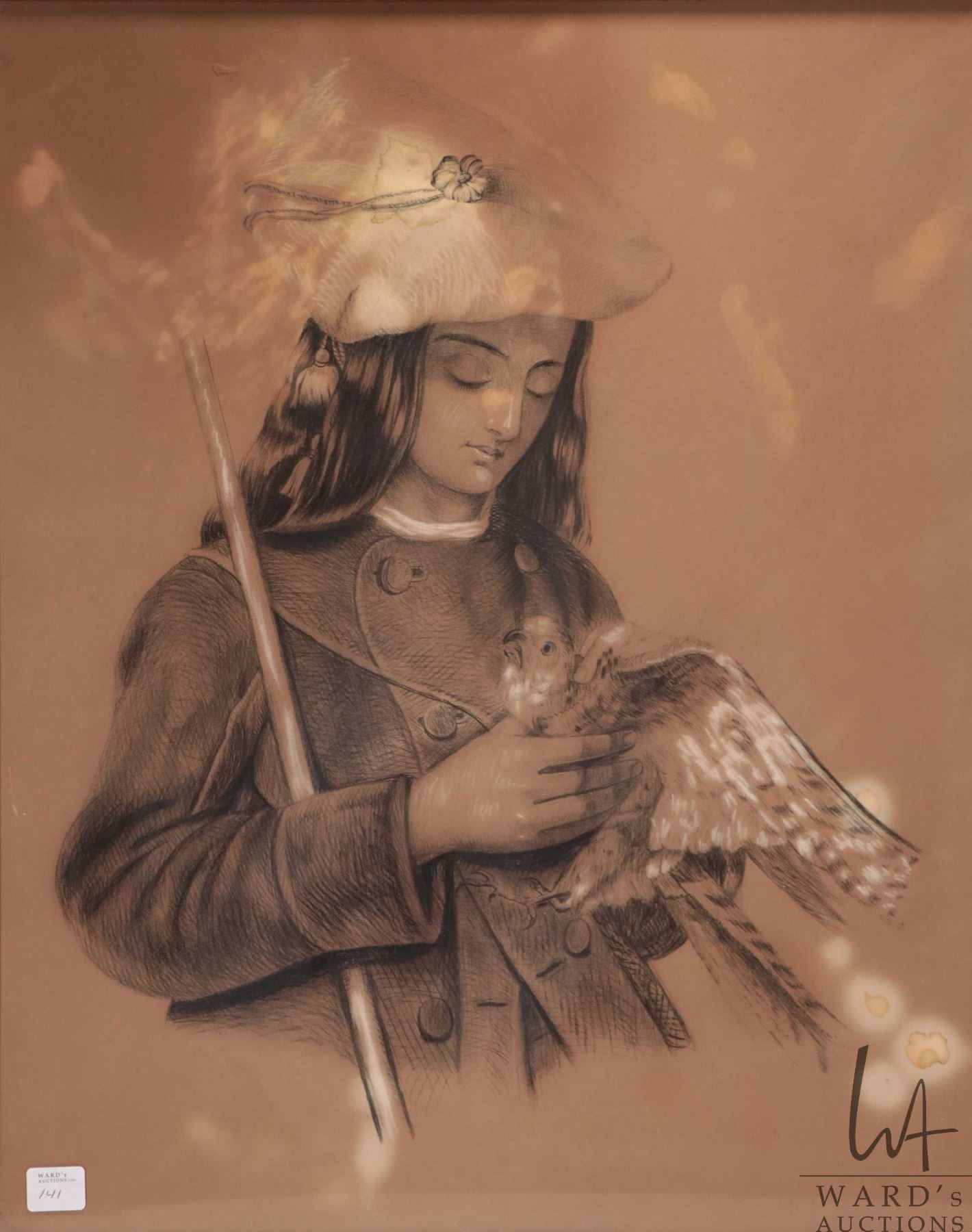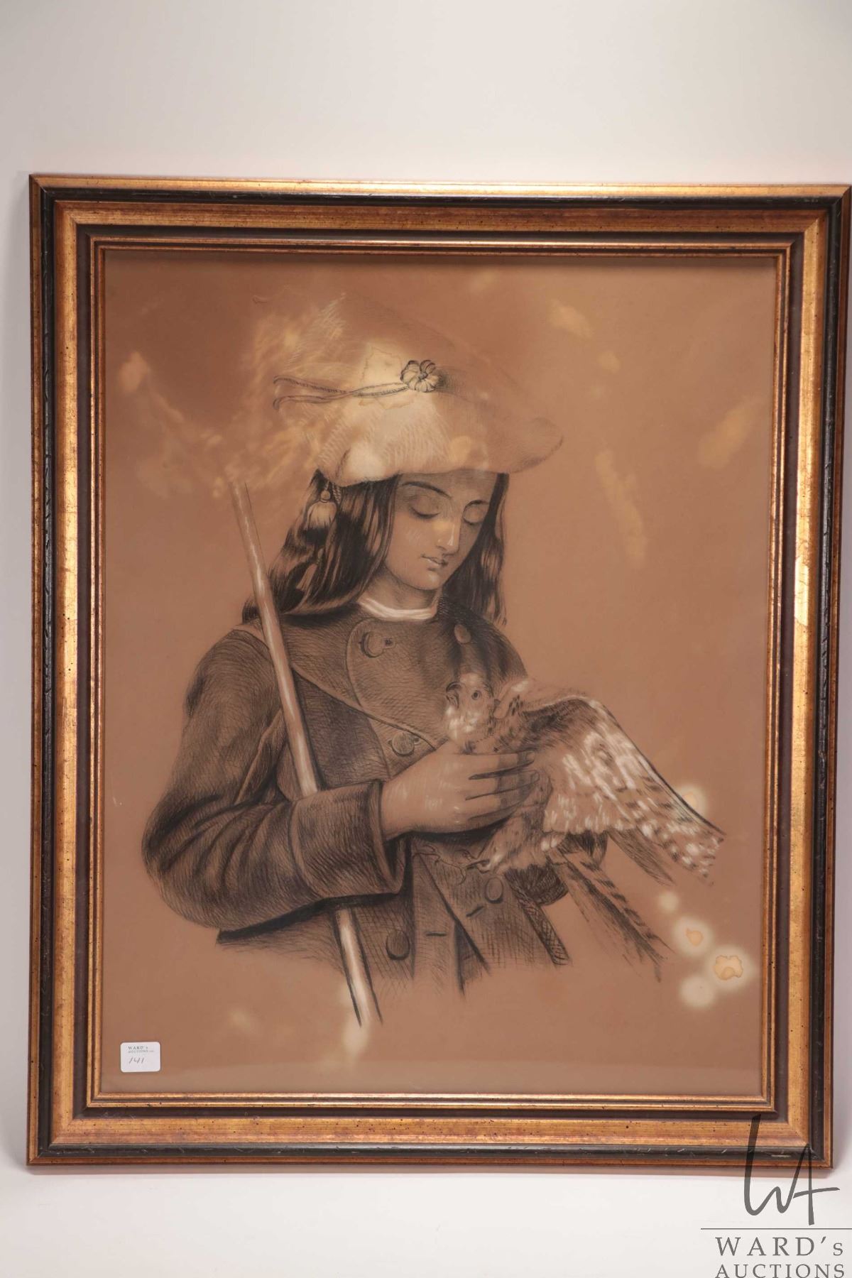 Antique unsigned charcoal and pastel drawing of a boy with a hawk, 21 1/2" X 17"