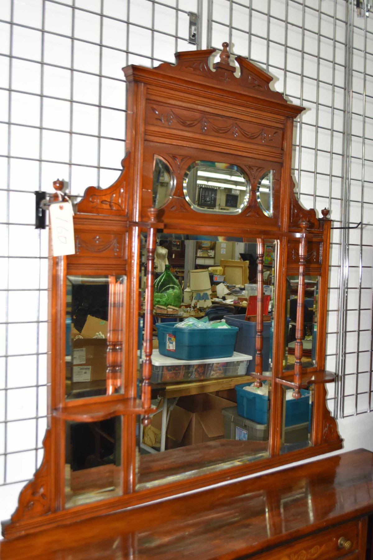 Antique walnut overmantle with carved and turned decoration and eight bevelled mirrors