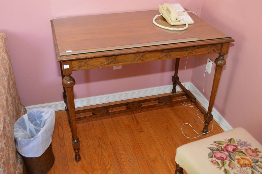 Antique walnut small library table with turned supports and stretchers and fretwork center stretcher