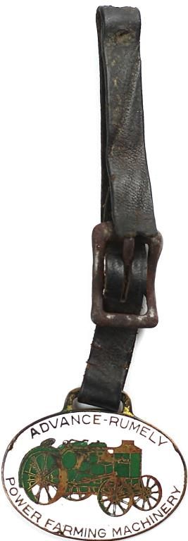 Antique watch fob marked Advance-Rumely Power, Farming Machinery to the enameled front, reverse marked Advance-Rumely Thresher Co. La Porte, Ind. Est. 200-400