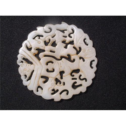 Qien Lung reign white jade disk in shape of a pendant with 2 dragons holding the character of good fortune. Above and below, there are carved a bat, symbol of wealth and good fortune (the character foo for bat is also identical with the good fortune. Diameter: 3" (7.5 cm.). Estimated value: $1500. Provenance: Dr. Veleanu's collection, the author of the illustrated reference book: "Jade, 5000 BC to 1912 AD, Guide to collectors".