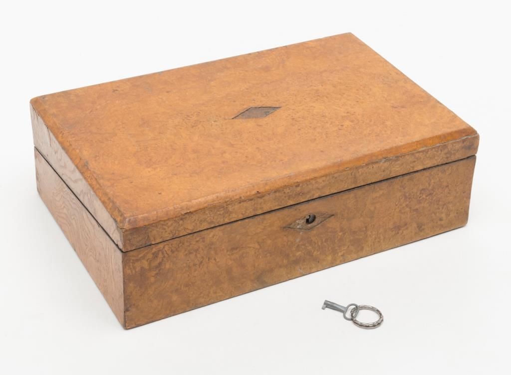 Antique wood field desk approx. 14” x 9” x 5” in overall fair to good condition; missing lid and lock escutcheons, much of bottom decorative paper cover; interior is overall good. Est.: $75-$150.